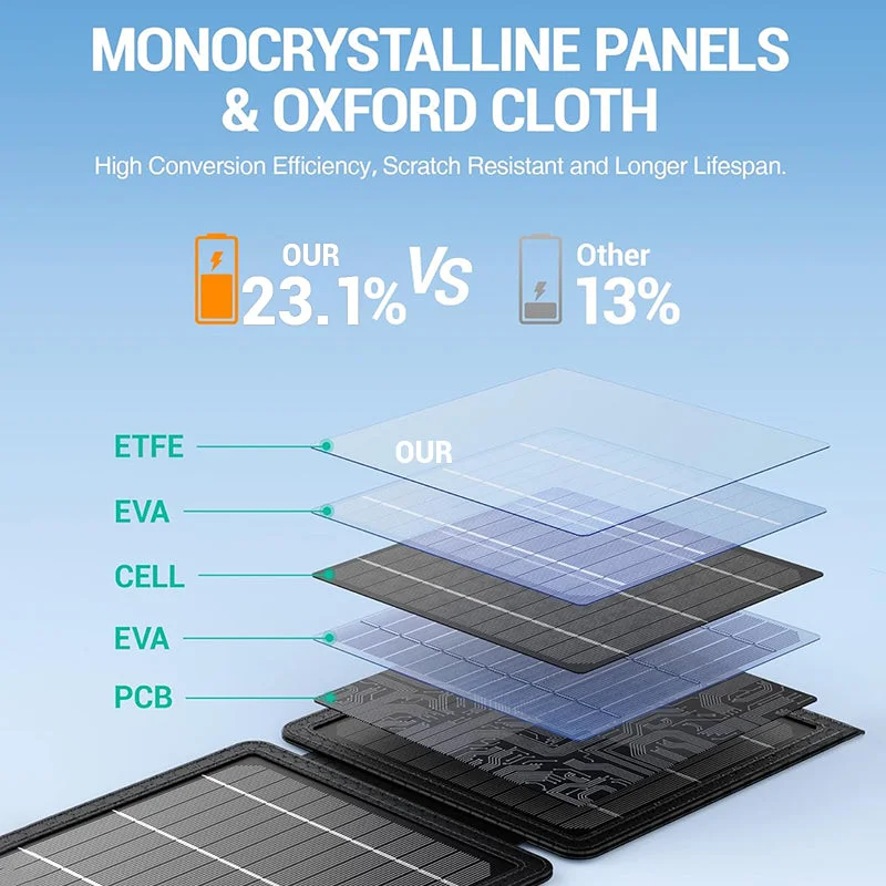 23.1% high conversion efficiency: 10W solar panels are made with premium mono-crystalline solar cells, generate energy from the sunlight, and perform better with 23.1% higher conversion efficiency, providing unlimited green power for your device under the sun.