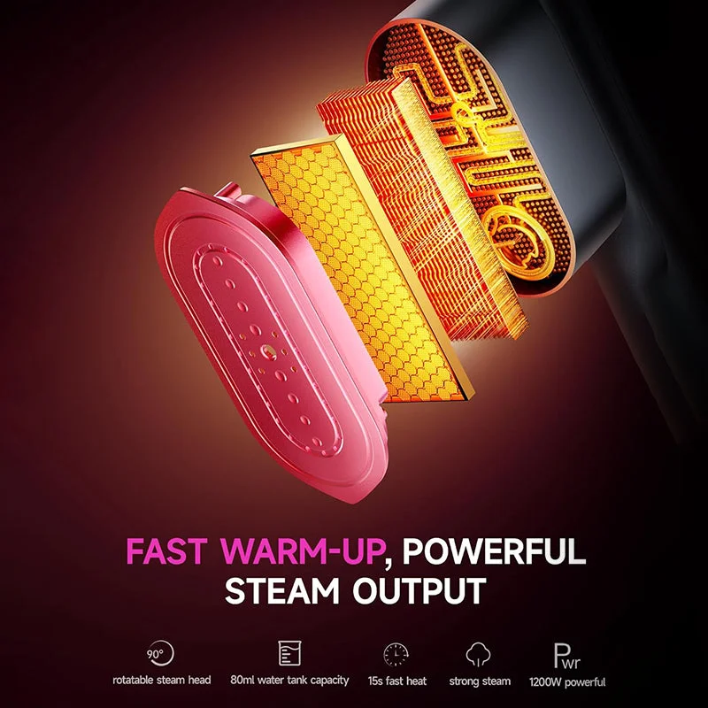 Efficient wrinkle removal & rotatable head design: Combining powerful steam iron for clothes injection with dry ironing, the portable steamer for clothes not only deeply penetrates fabrics to quickly remove wrinkles but also the rotating head design allows for use at any angle, meeting diverse ironing needs.