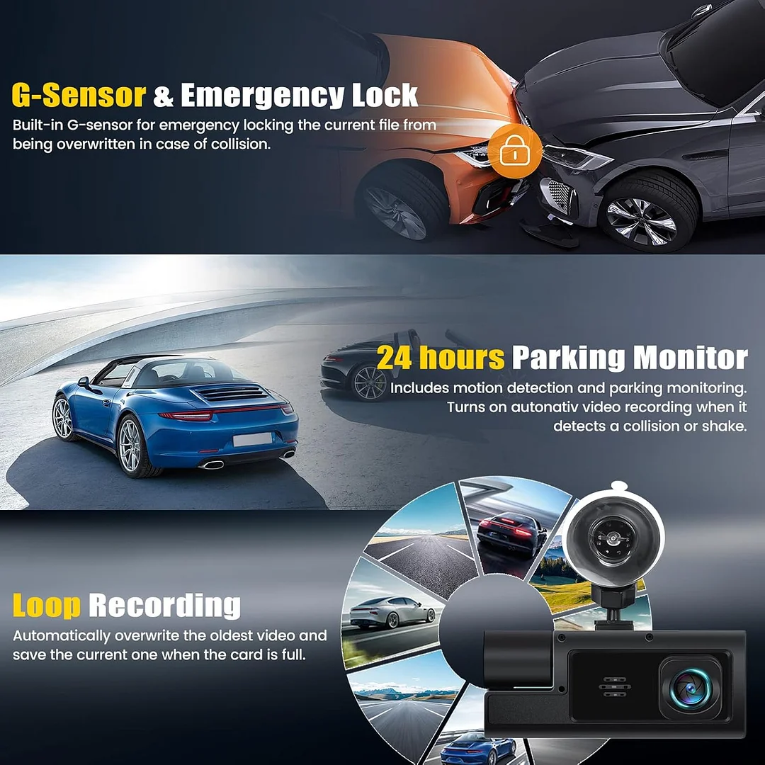 【Loop Recording &Accident Lock】:Loop recording will overwrite the oldest videos when the SD card is full and make sure the dash cam continuous recording. Built-in G-sensor,when a sudden shake/collision of the car is detected.The dash cam will automatically start recording for 30 seconds.The accident video will be locked and will not be overwritten.