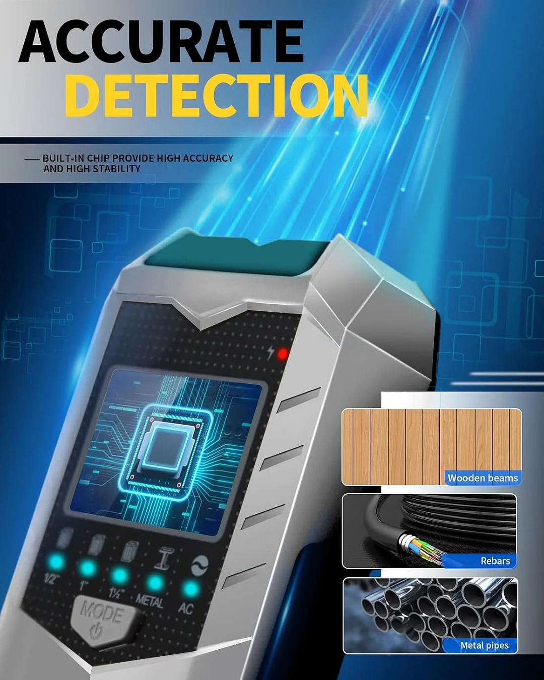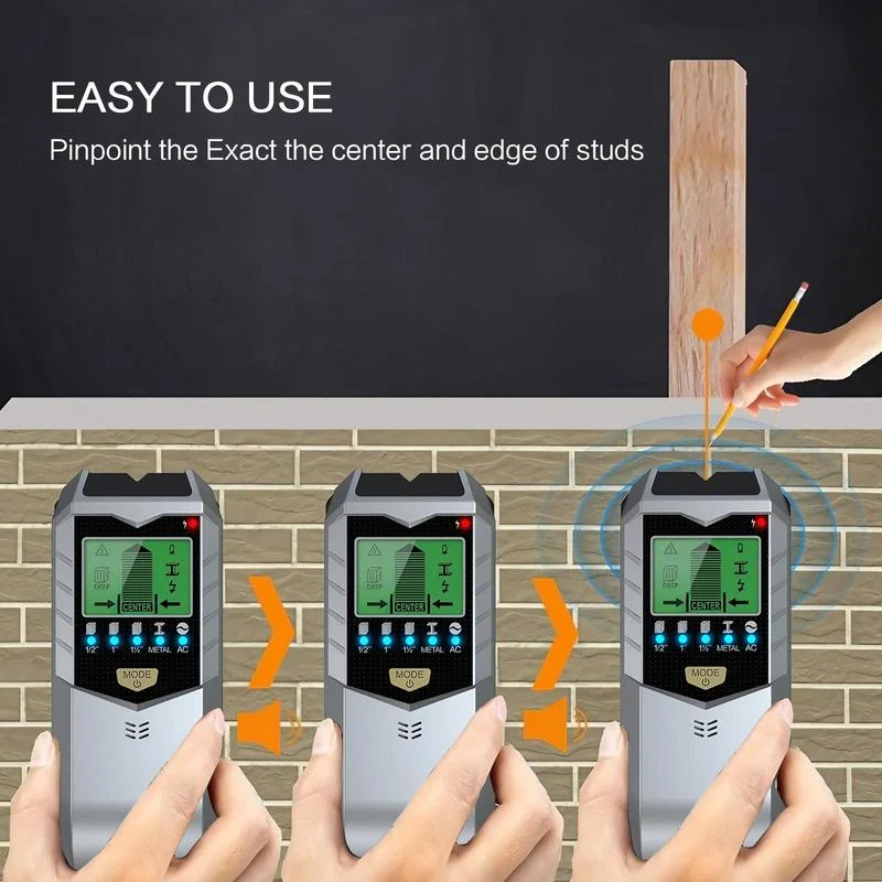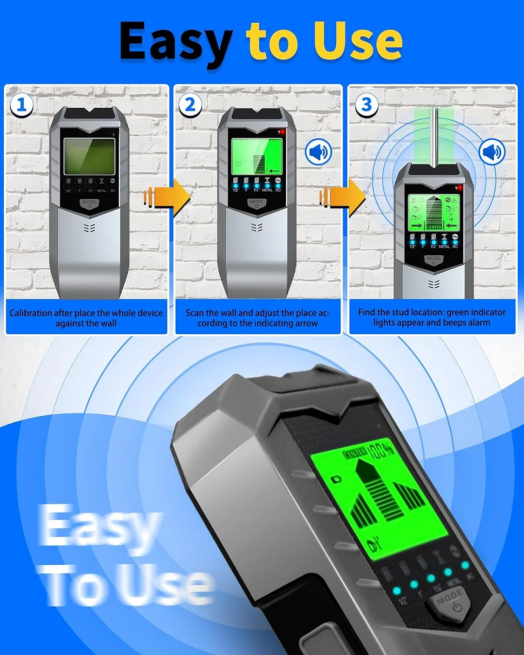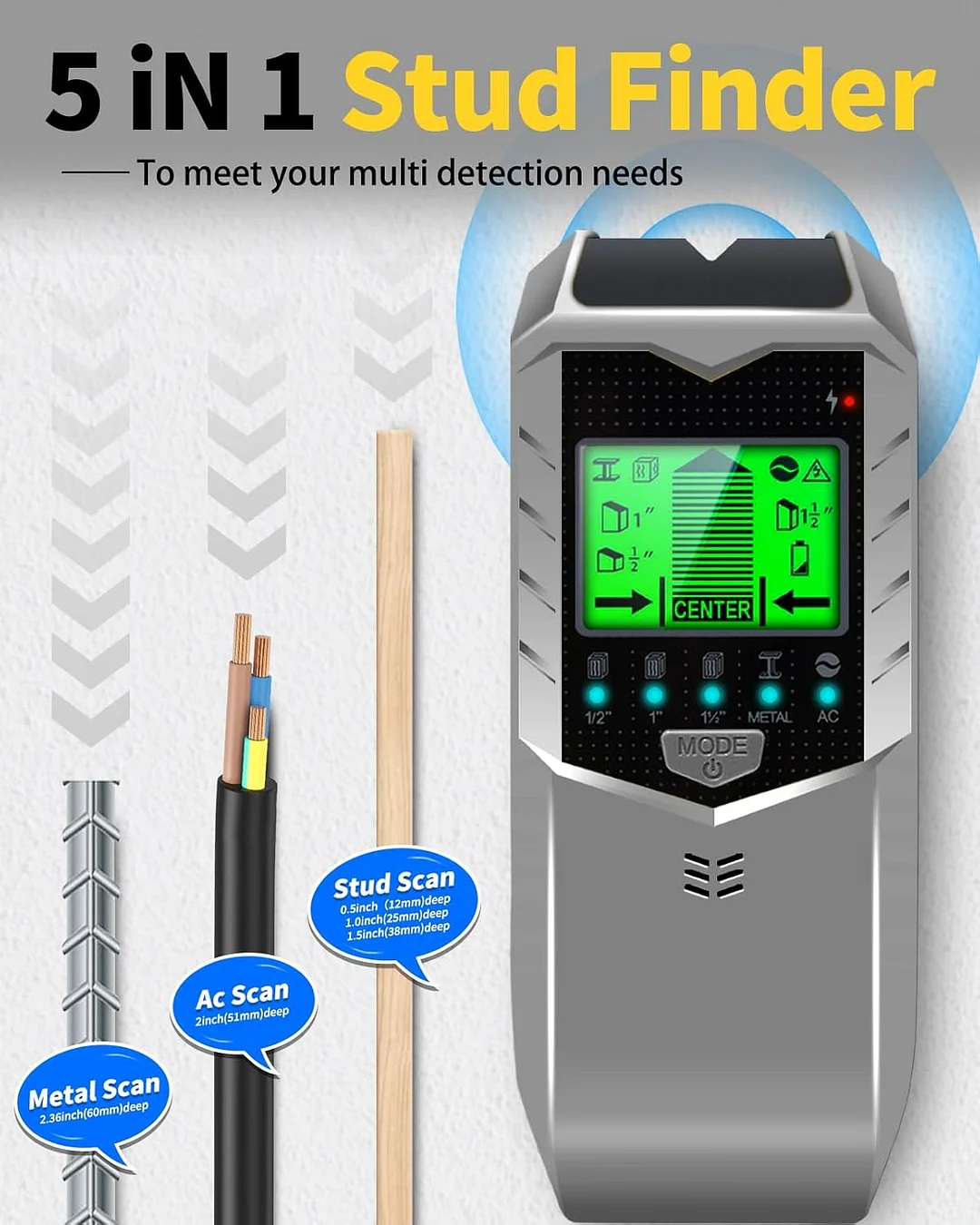 This stud finder swiftly locates wood, metal, and AC wires concealed within walls, floors, and ceilings, ensuring safety when installing TV mounts, photo frames, wall cabinets, garage racks, shelves, bathroom handles, and other decorations.