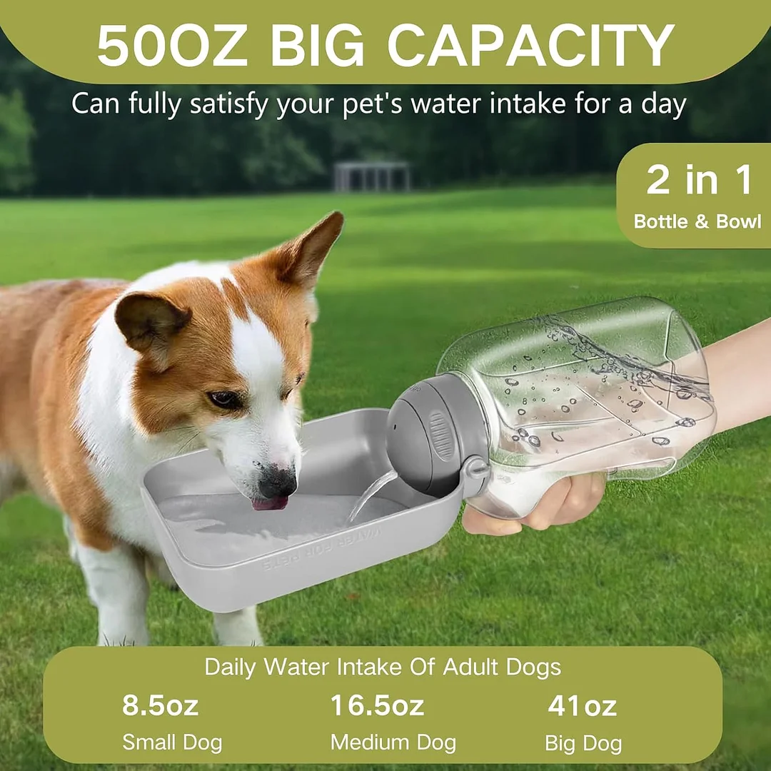 Large capacity for all-day hydration: This dog water bottle comes in a large 50oz capacity and a 2-in-1 water and food bottle, ensuring medium to large dogs stay hydrated during long walks, hikes, or travel.