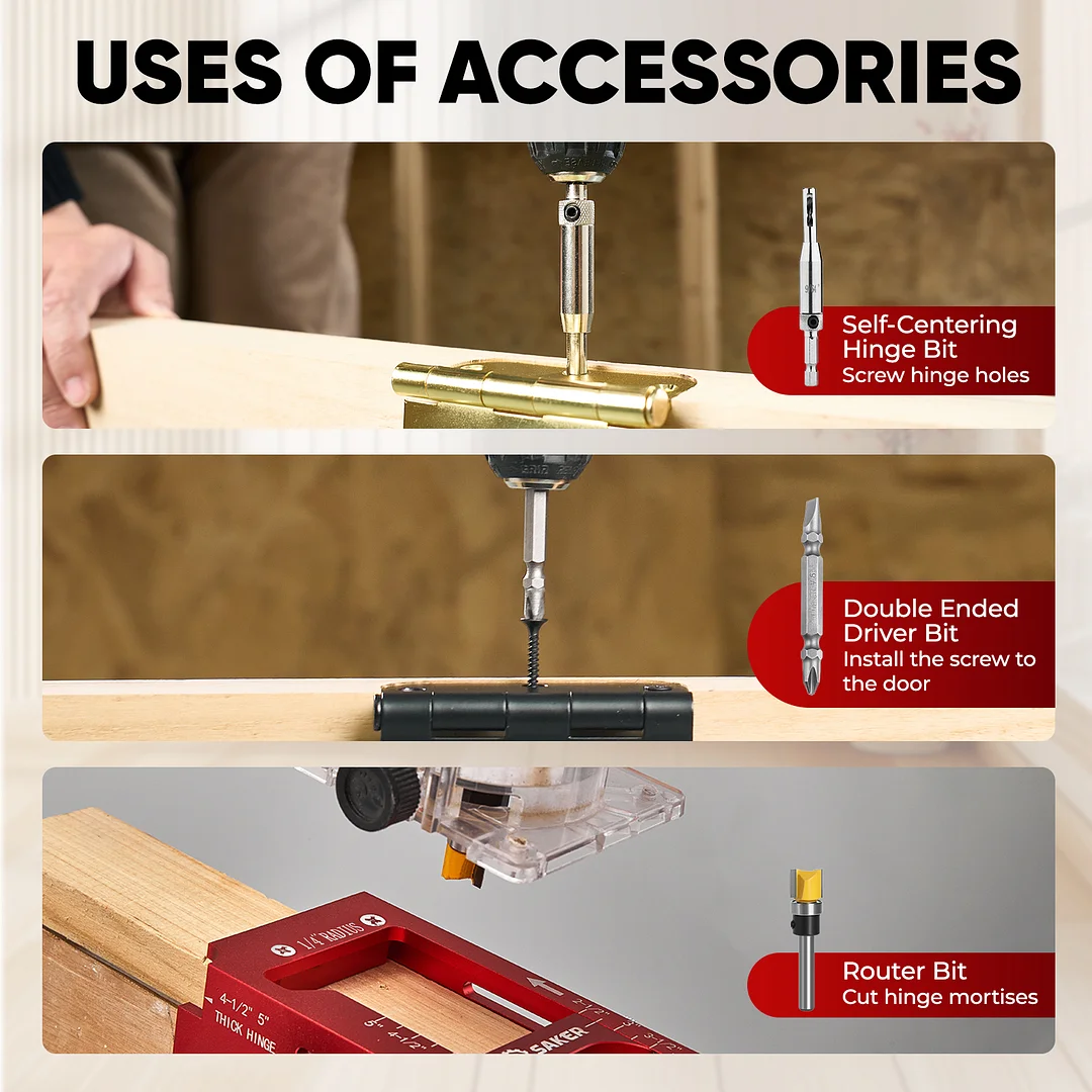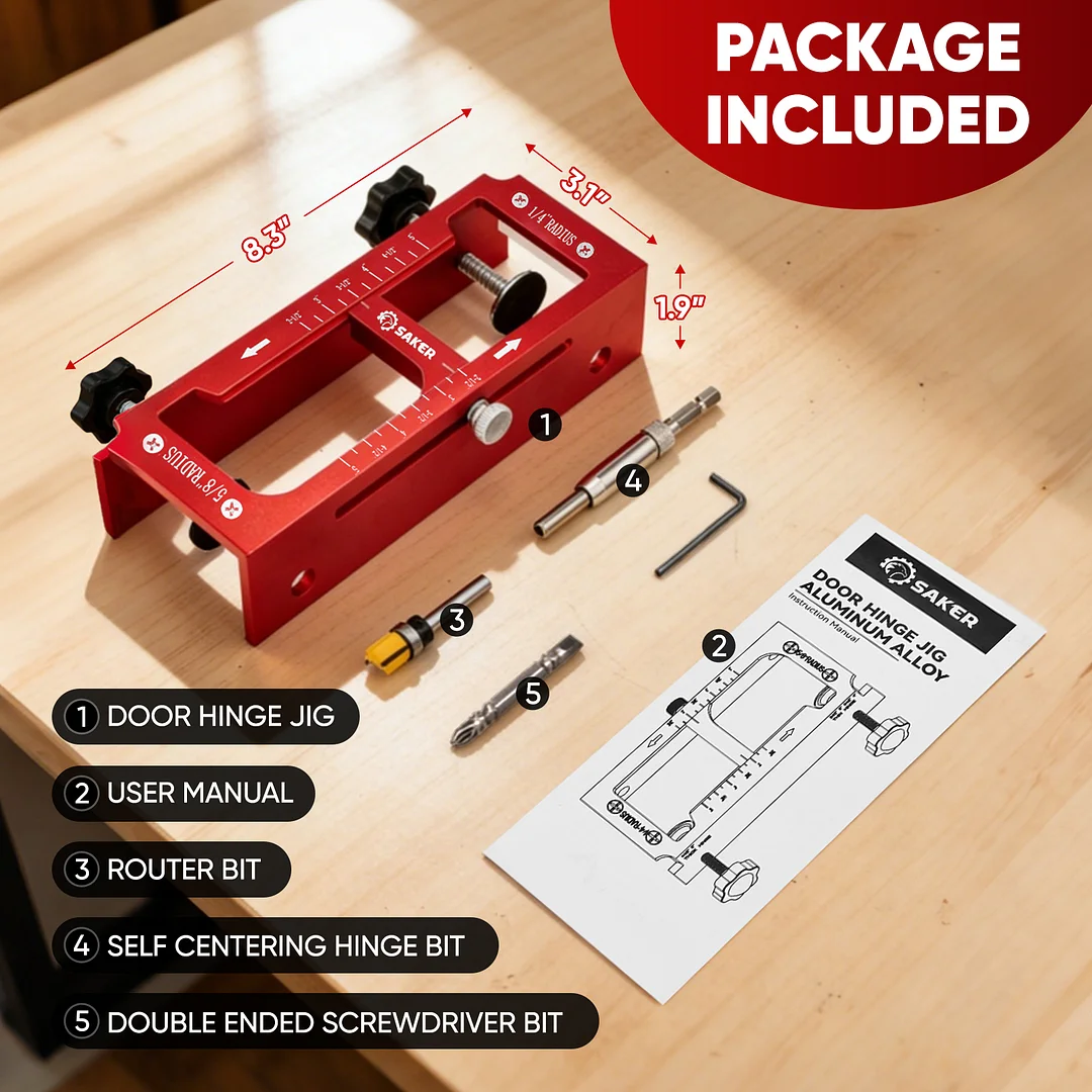 Complete package: The kit includes one door hinge jig, one router bit, one self-centering hinge bit, one dual-head screwdriver bit, and one user manual, providing everything required for precise hinge cutting and installation.