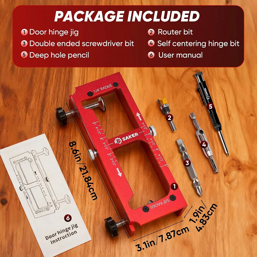 Complete package: Includes one door hinge mortise template, one deep hole pencil, one router bit, one self-centering hinge bit, one dual-head screwdriver bit, and one user manual. This comprehensive door installation kit provides everything needed for precise hinge cutting and installation.