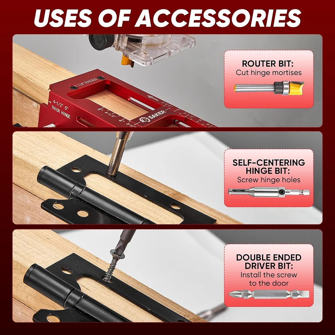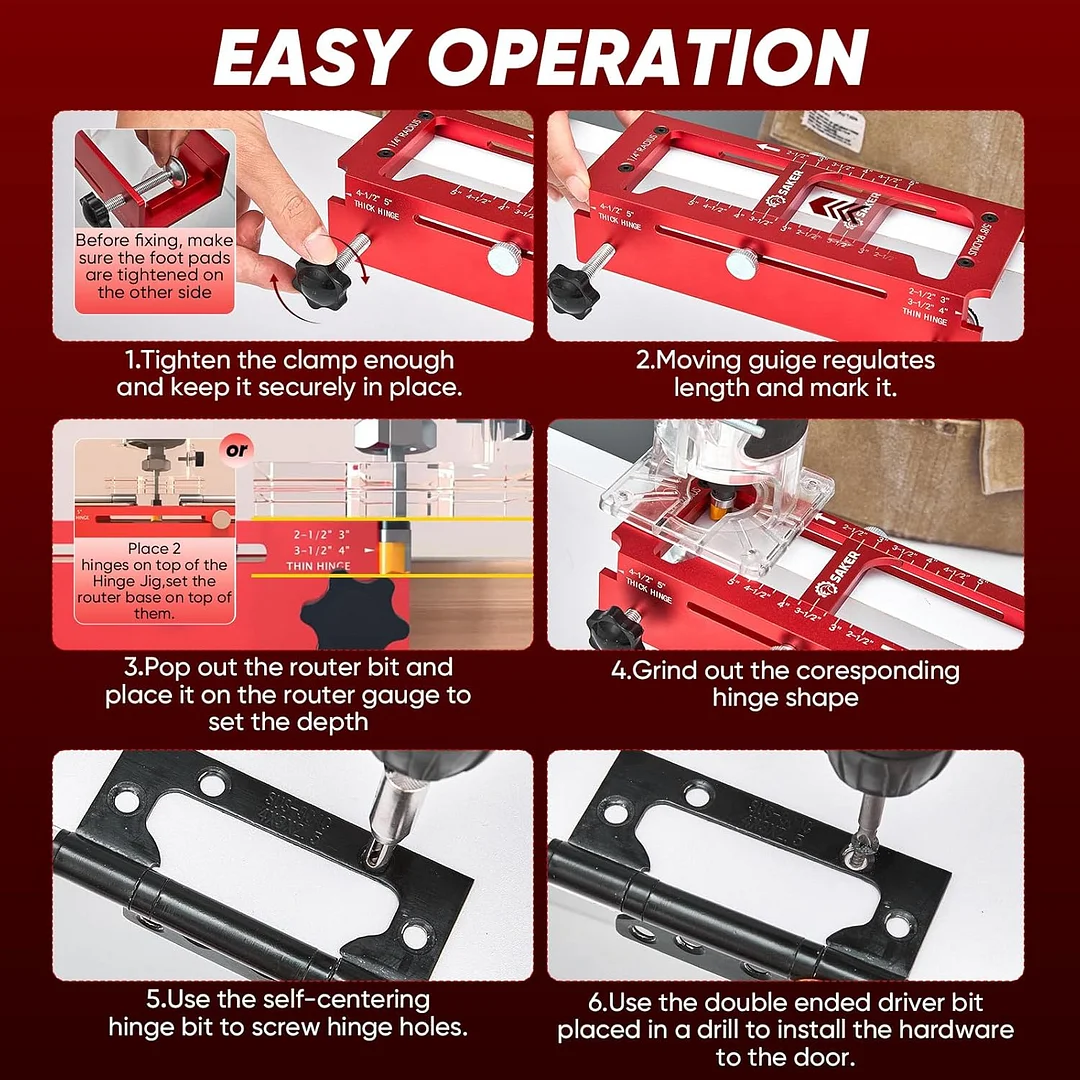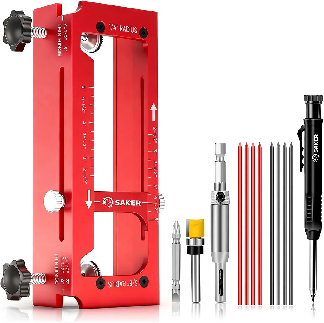 Precision & ease of use: Equipped with a built-in depth gauge, the Saker door hinge jig accommodates both thick and thin hinges, ensuring precise cuts every time while reducing the need for multiple tools.