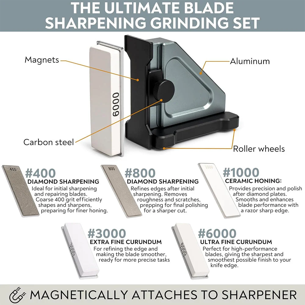 Comprehensive sharpening set: Includes diamond sharpening stones (#400, #800), ceramic honing (#1000), and extra fine curundum stones (#3000, #6000) for complete blade refinement.