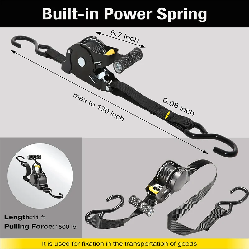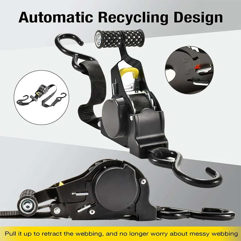 Smart automatic retracting design: Say goodbye to messy webbing and tangled straps. The built-in power spring automatically retracts excess webbing into the durable housing with a simple pull. This keeps your cargo area neat and prevents dangerous loose strap ends from flapping in the wind during transport.