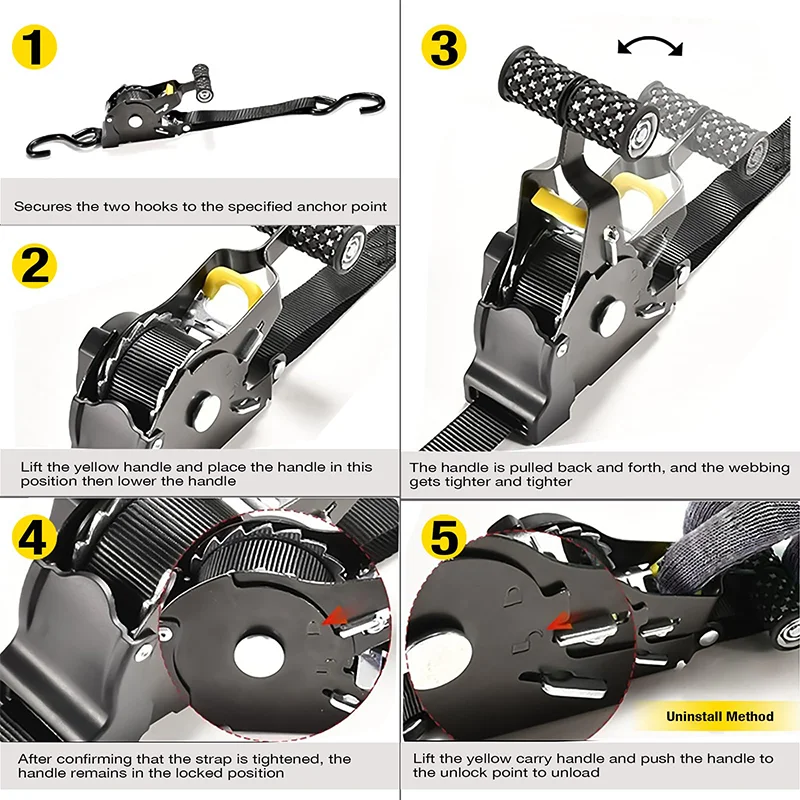 Quick and effortless operation: Designed to save you time, the smooth ratcheting mechanism allows you to secure loads in seconds. The intuitive one-button release system makes unloading just as fast, eliminating the frustration of fighting with jammed mechanisms common in traditional tie-downs.