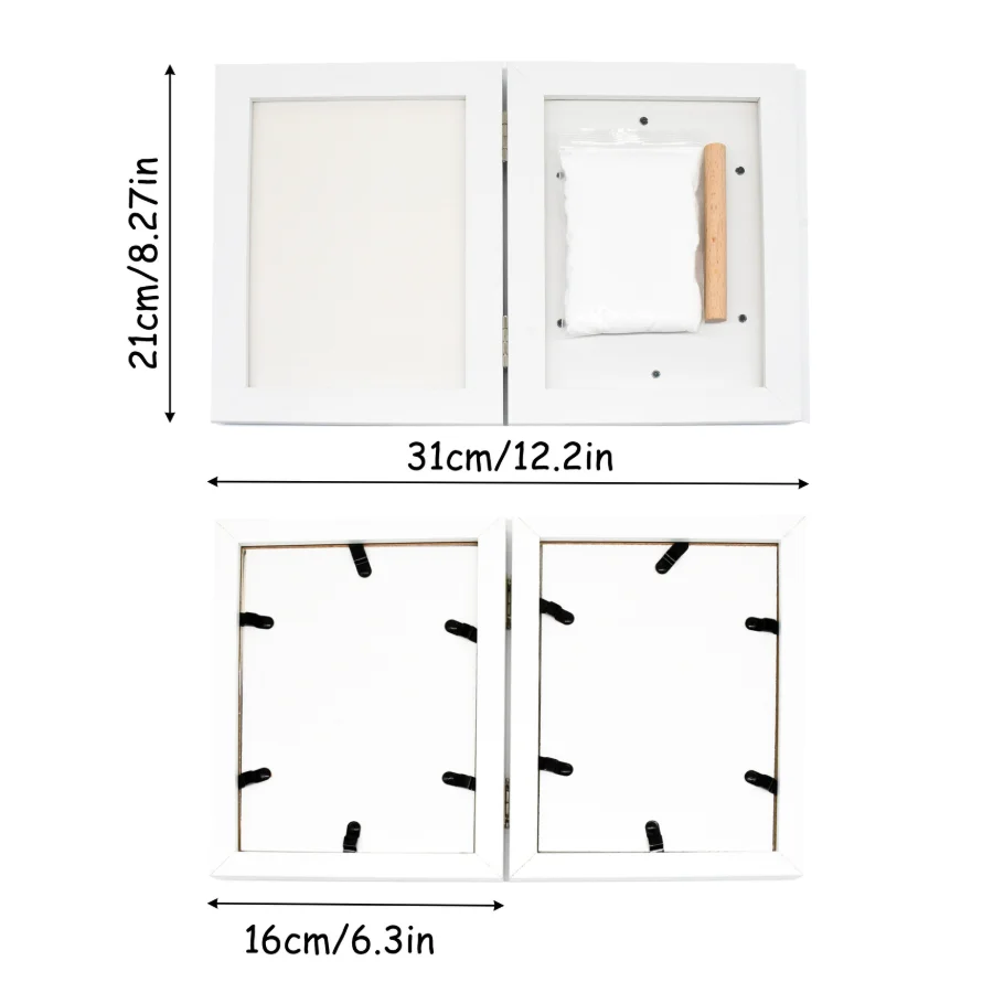 All inclusive: Complete baby handprint and footprint keepsake kit includes a high quality double photo frame for 5x7 inch pictures with hanging or standing options, soft clay, rolling pin, and double sided tape to make creating lasting memories simple and enjoyable.