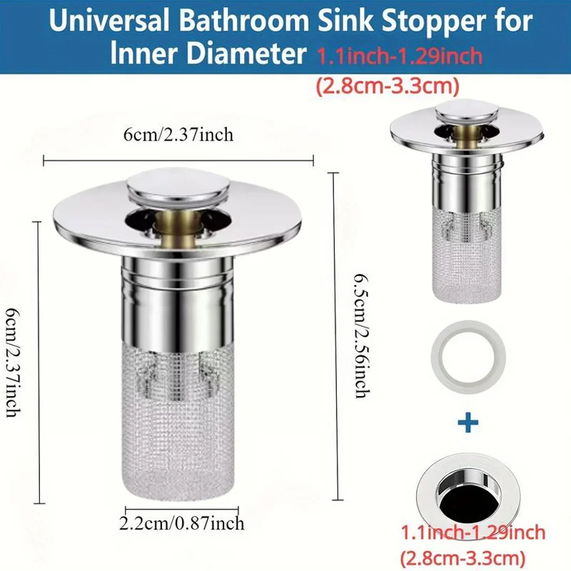 Universal Compatibility: This sink drain strainer fits 99% of sink holes, with an inner diameter range of 1.34 inches to 1.57 inches. Whether it's a washbasin, bathroom sink, or shower tub, this hair catcher is suitable for various sink types. It comes with two sizes of rubber rings (34mm and 40mm) to ensure a tight fit with various drainage sizes.