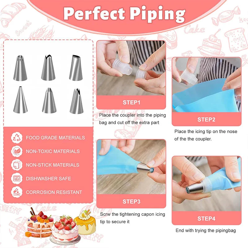 Complete professional piping set: This kit includes various numbered stainless steel tips, couplers, and reusable pastry bags, allowing you to create intricate flowers, borders, and lettering with pro-grade precision.