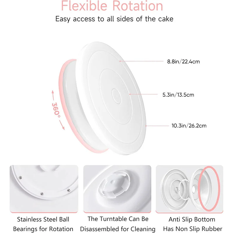 Smooth revolving cake turntable: Featuring hidden ball bearings for seamless 360-degree rotation, this non-stick turntable allows for effortless icing and decorating from every angle for both right and left-handed bakers.