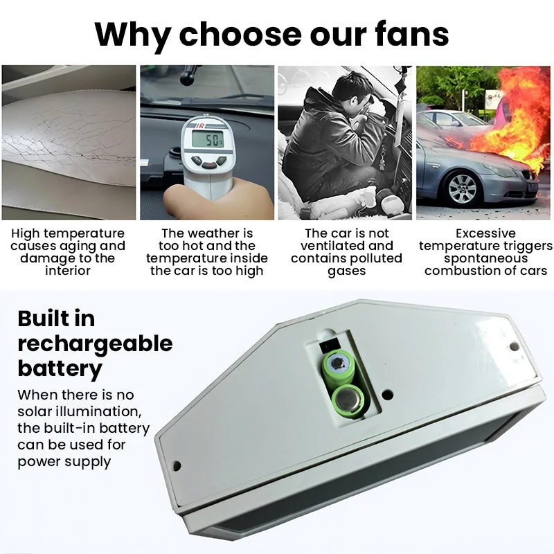 Eco-friendly solar energy operation: Harnessing solar power, this fan operates without draining your car's battery, offering an environmentally friendly solution to maintain airflow and comfort inside your vehicle.