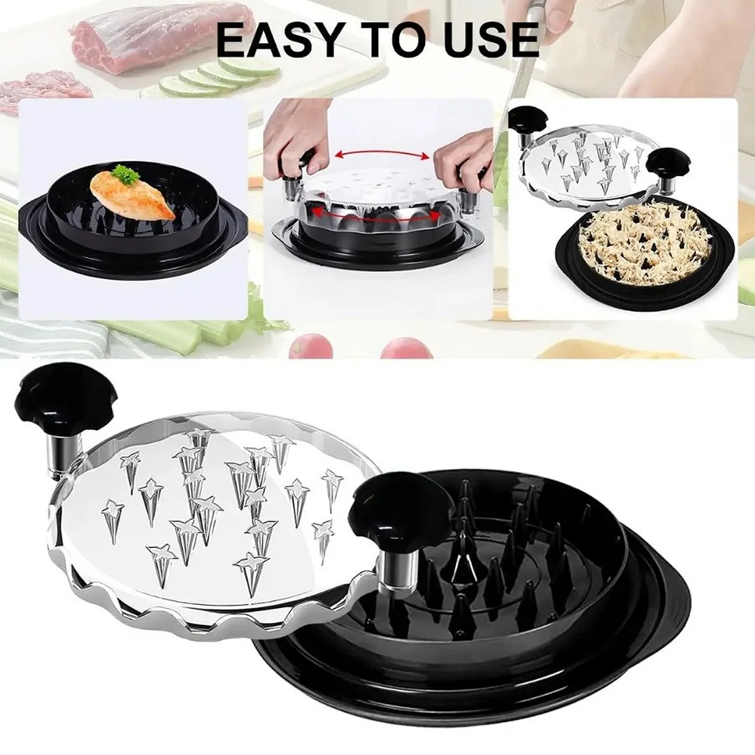 How to Use: First, cook the meat and cut it into small pieces. Avoid using raw meat as it can damage the spikes. Divide the small pieces into three parts and place them in the shredder. Twist multiple times to achieve the desired shred consistency. Once the meat is shredded, visible through the clear lid, open the cover and transfer the meat to a bowl to prepare your delicious meal.
