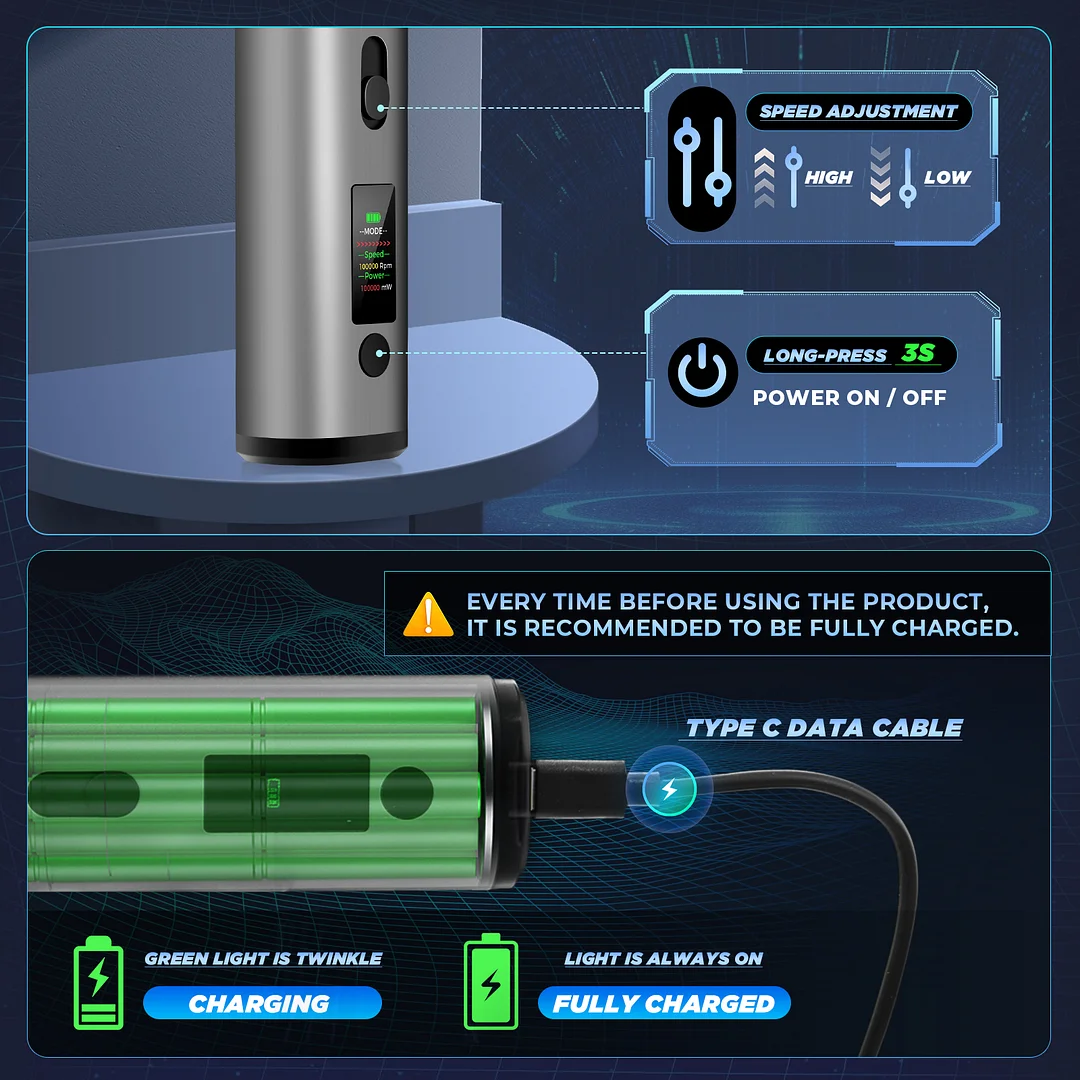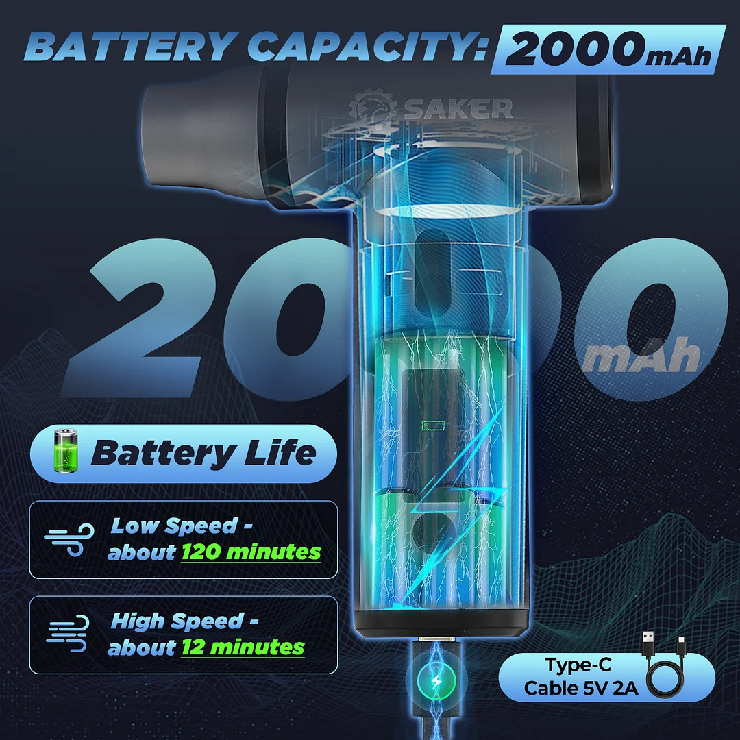 Powerful Brushless Motor: Engineered with a high-speed brushless motor, the Saker Mini Air Blower delivers robust performance. It offers adjustable airflow settings, reaching up to an impressive 110,000 RPM. This powerful motor ensures efficient operation across various tasks, from gentle blowing to intense drying.