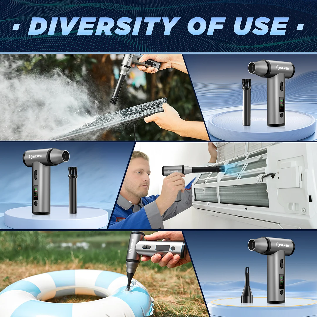 Multi-functional Air Duster: Saker compressed air duster includes a rich set of accessories. It can not only clean dust efficiently, but also inflate swimming rings, dry pet hair, and even vacuum storage bags. One machine with multiple functions can meet the needs of various scenarios in life, making your operation more convenient and efficient.