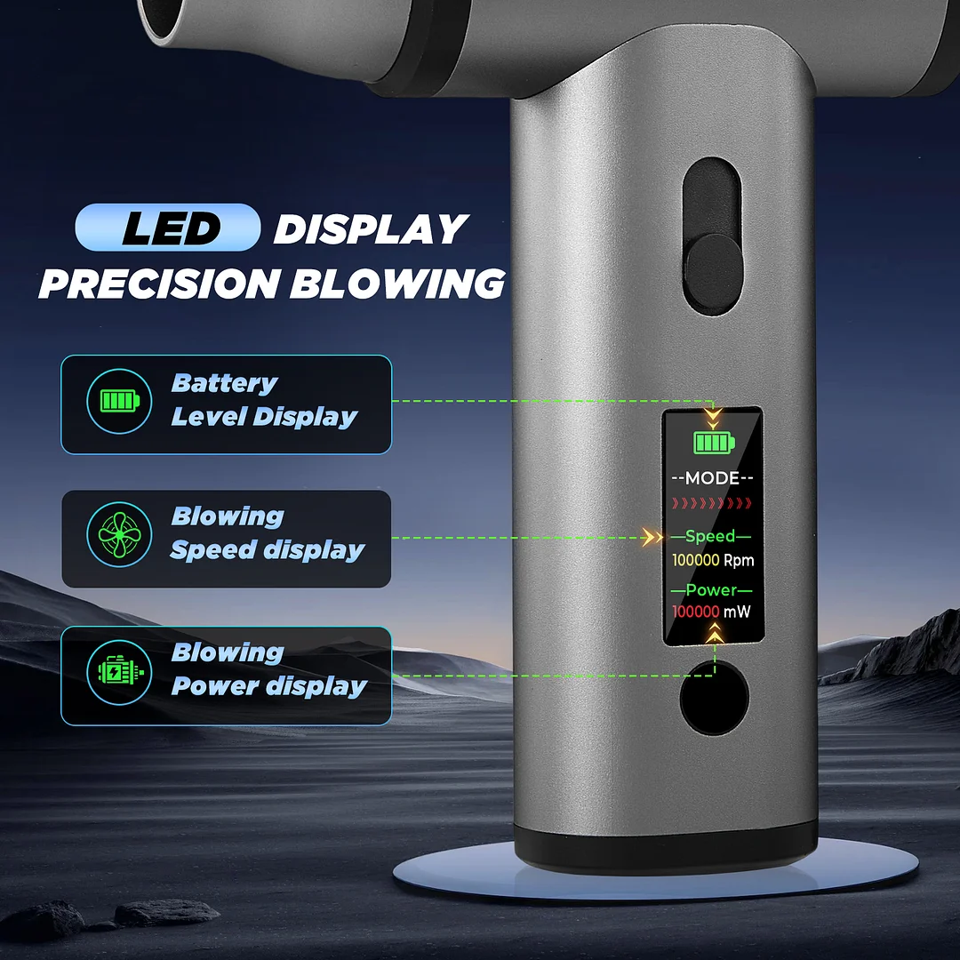 Rechargeable & intelligent management: Equipped with USB-TepyC charging cable, 2-3 hours fast charging, and can last for 0.5~3 hours depending on the wind speed. The LED display shows the speed, power, and power in real-time, and the operation is simple and intuitive, allowing you to manage various cleaning, drying, and exhaust tasks more scientifically.