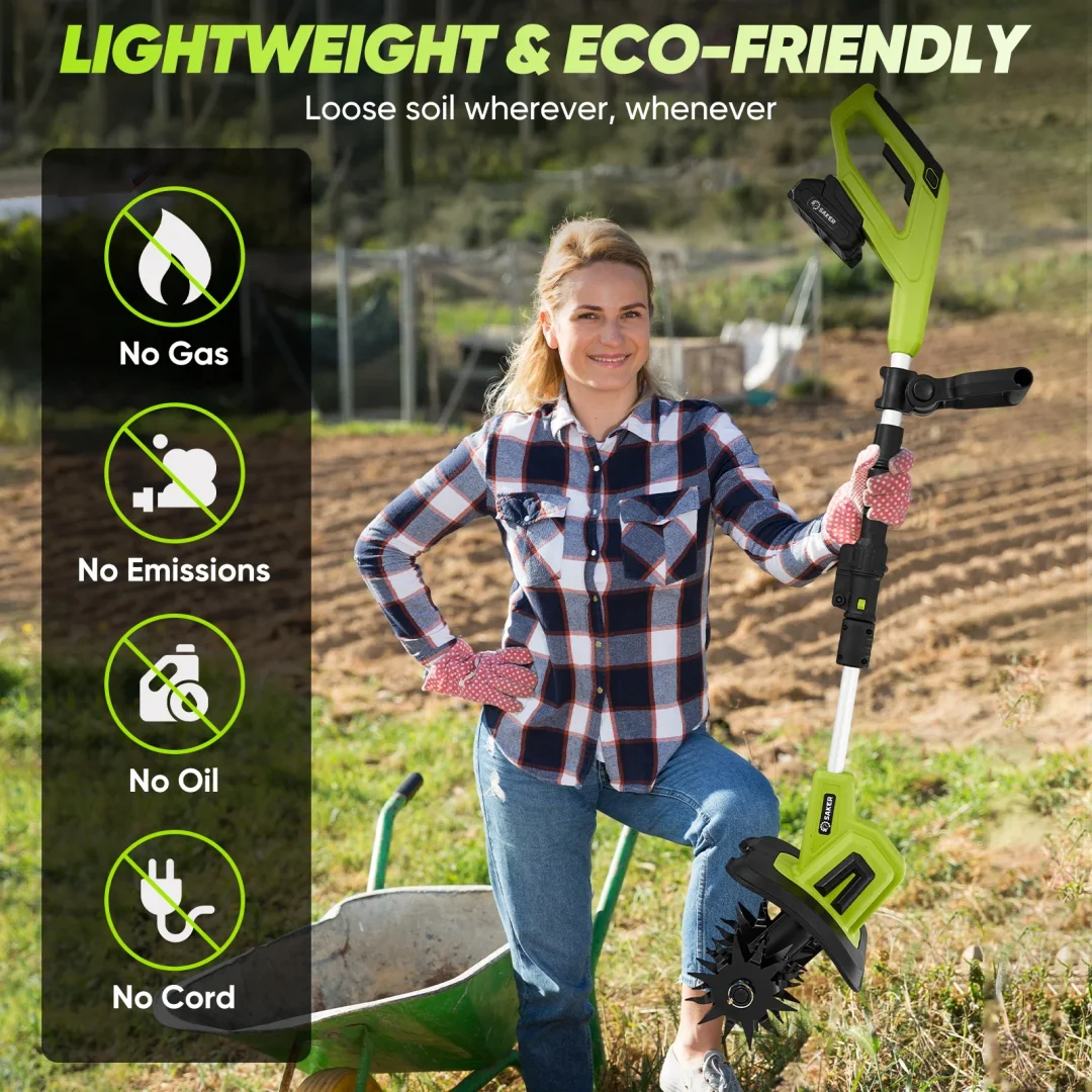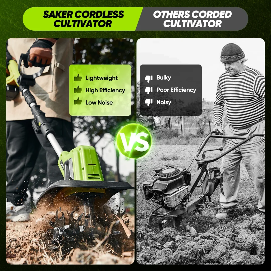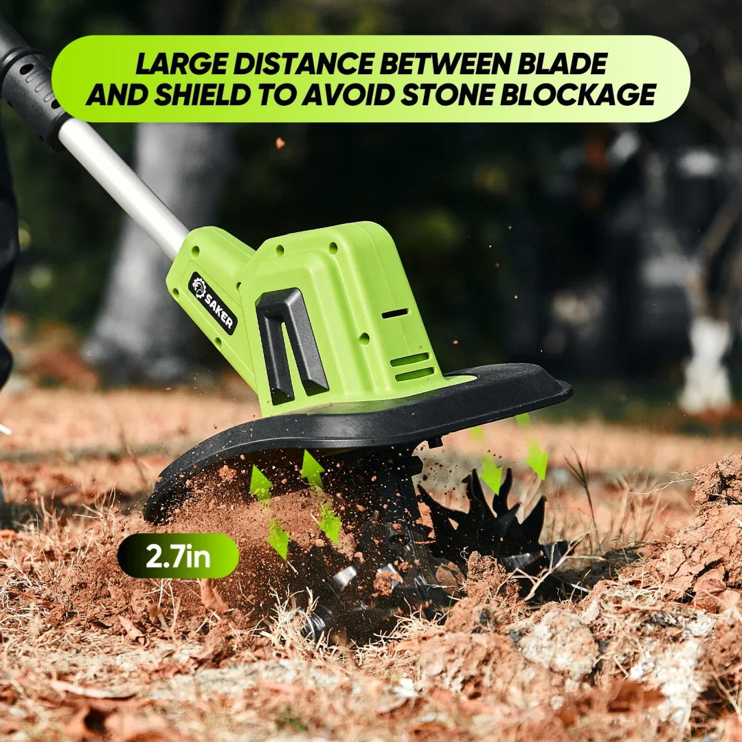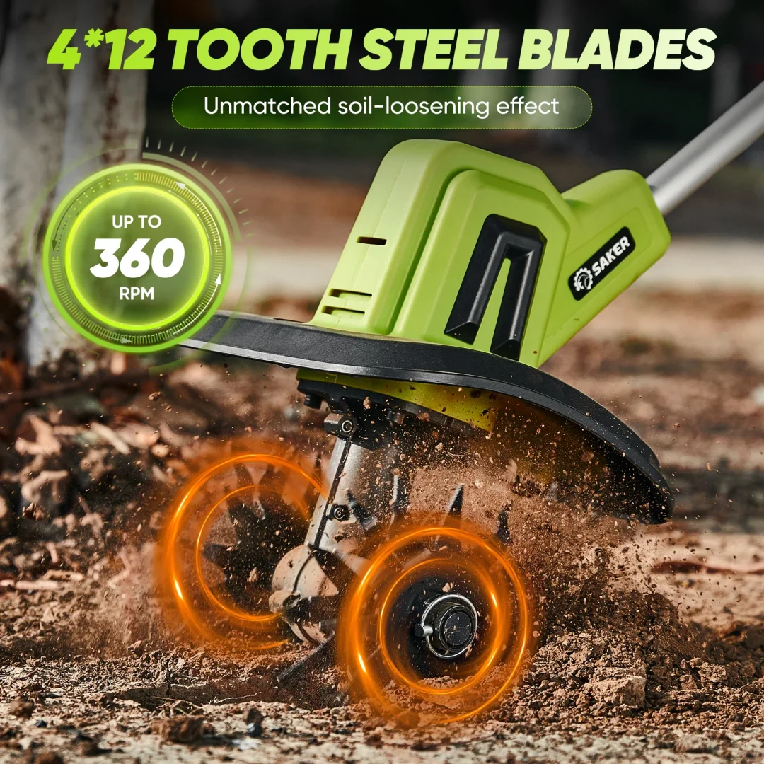 No cords, no limits: Say goodbye to tangled cords and outlet hunting! Saker Cordless Garden Tiller gives you complete freedom to tackle soil cultivation, weeding, and planting—anywhere, anytime. Perfect for small gardens, backyards, and hard-to-reach spaces.