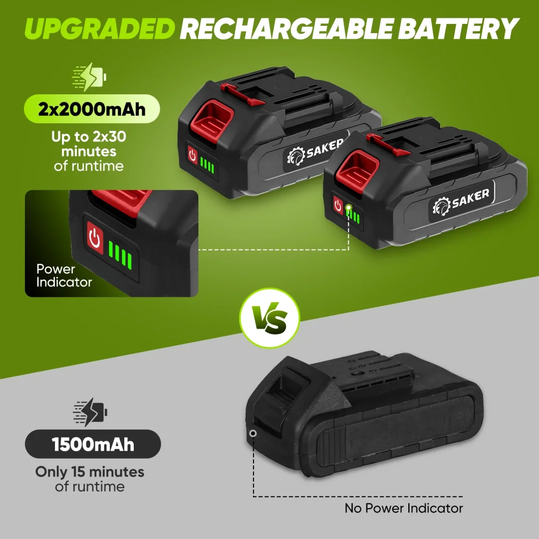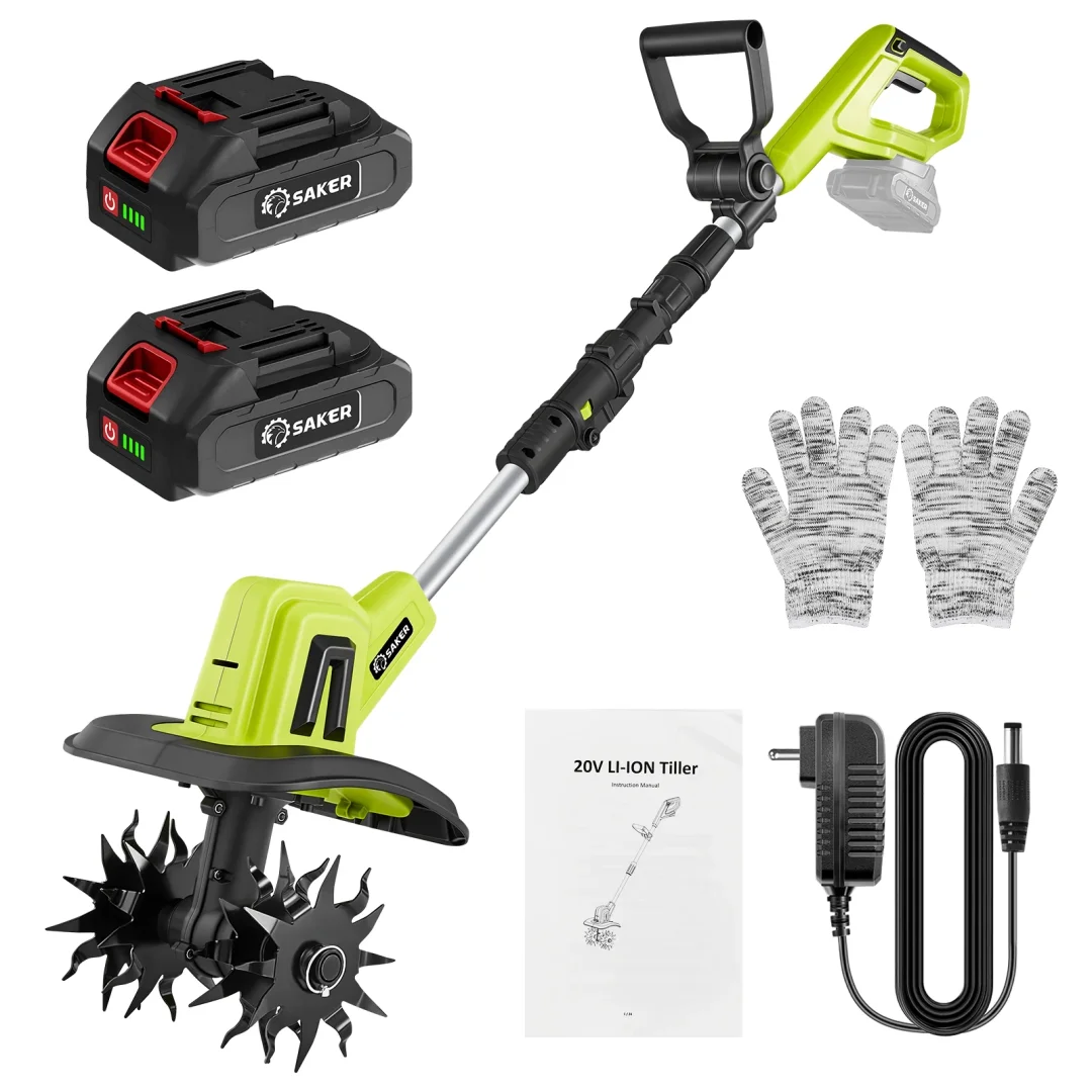Long-lasting battery power: Saker tiller comes with two powerful 22V lithium-ion batteries (2000mAh each). With up to 30 minutes of continuous use per battery, you'll enjoy uninterrupted gardening time - when one battery runs low, simply swap in the fully-charged spare and keep working!