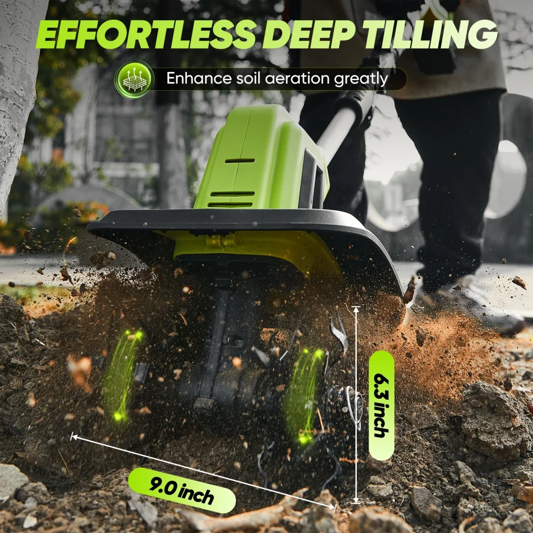 Strong & efficient performance: This cordless tiller packs serious power with its high-speed 360RPM motor and 4 tough steel blades. It digs 9 inches wide and 6.3 inches deep - perfect for breaking up tough soil, letting air reach plant roots, and ripping out weeds effortlessly. No job is too big for this little powerhouse!