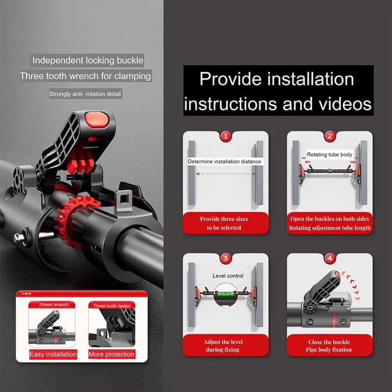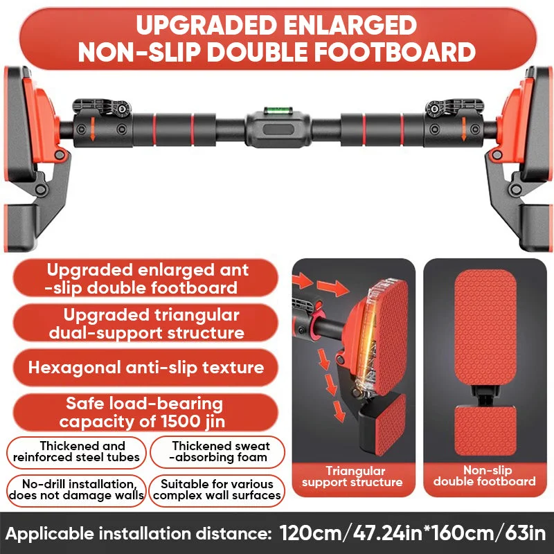 Scientifically Designed for Safety: Features dual support foot boards that require no additional fixing equipment; a special three-bearing transmission structure that becomes firmer as the load increases; a dead suspension bar with an independent locking key and buckle to ensure the steel pipe does not slide due to rotation; and a level gauge to assist with correct horizontal installation, maximizing the effectiveness of the hanging exercise bar.