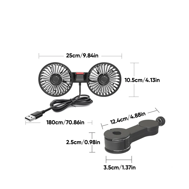 360-Degree Rotation: Both the fan heads and the base can rotate 360 degrees, ensuring cool air reaches every corner of the backseat. This car fan efficiently removes smoke, unpleasant odors, dust, and pet smells, enhancing air circulation and keeping the car's interior fresh and cool.