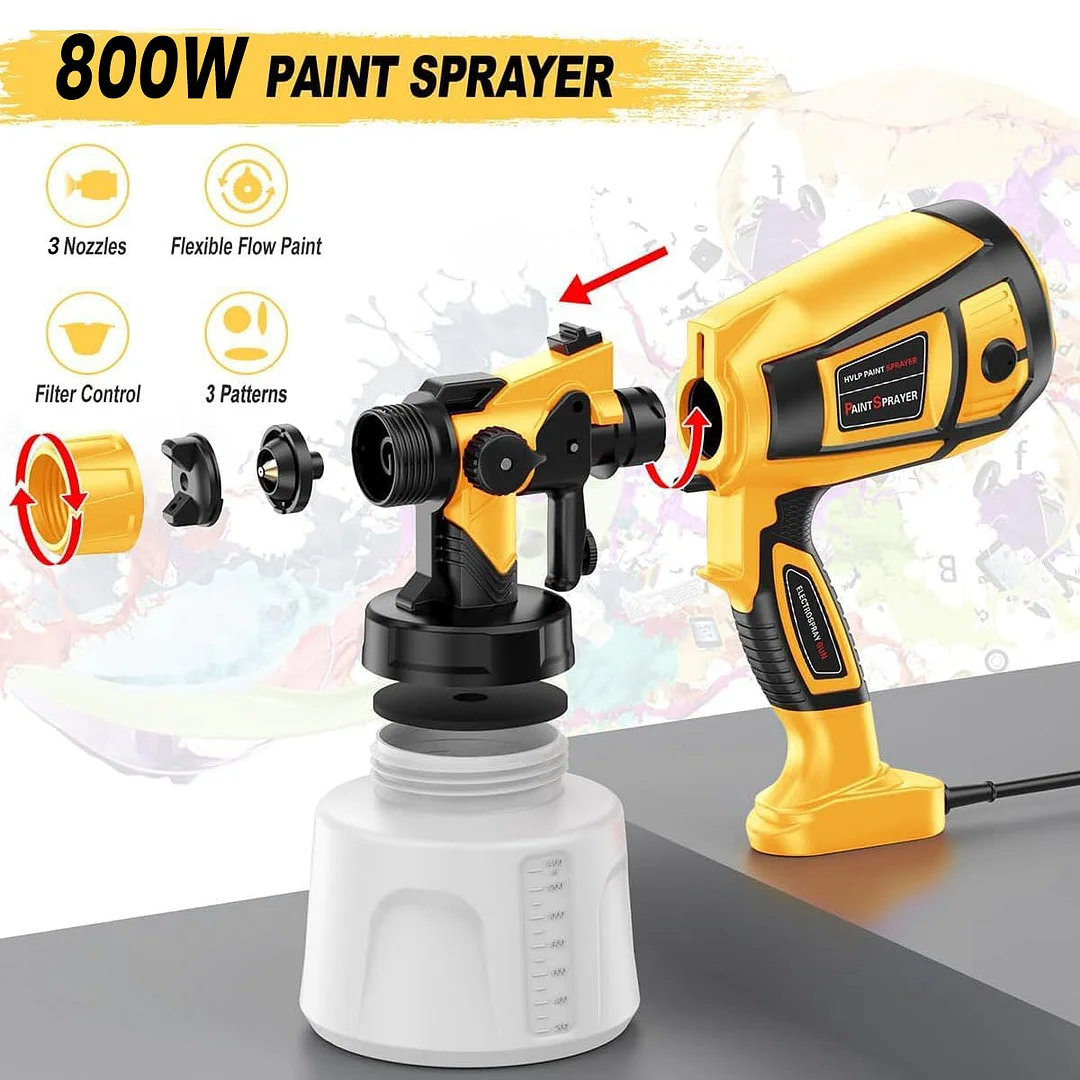 Powerful performance, efficient spraying: Equipped with an 800W high-power motor and a large-capacity paint container, this sprayer significantly boosts work efficiency. It easily handles large-area tasks and is a high-performance alternative to traditional rollers and brushes.