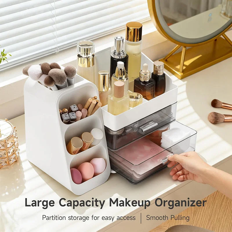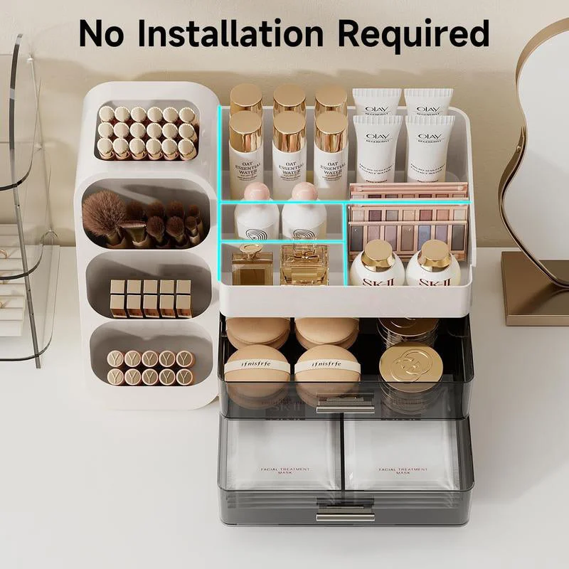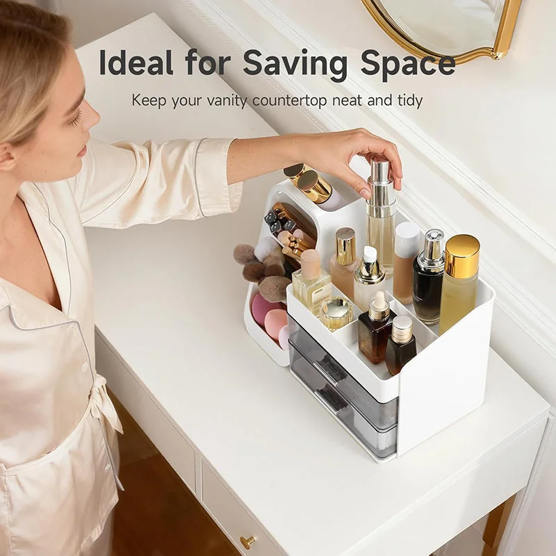 Capacity: High-capacity compartmentalized storage with three layers and powerful organization, including space for tall skincare bottles, two large drawers for facial masks or vanity kits, and eight compartments for moisturizers, lotions, lipsticks, nail polishes, makeup brushes, eyeliners, eyeshadow palettes, and other small everyday items to keep your vanity desk in order.