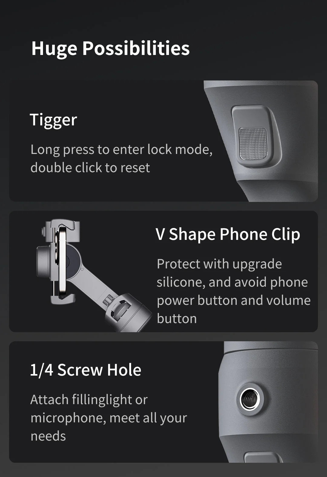 Anti-shake: Our gimbal uses leading anti-shake technology to provide professional anti-shake performance, which can eliminate shaking during movement and ensure that the photos and videos you take remain stable. Gimbal is suitable for any scene and captures every wonderful moment