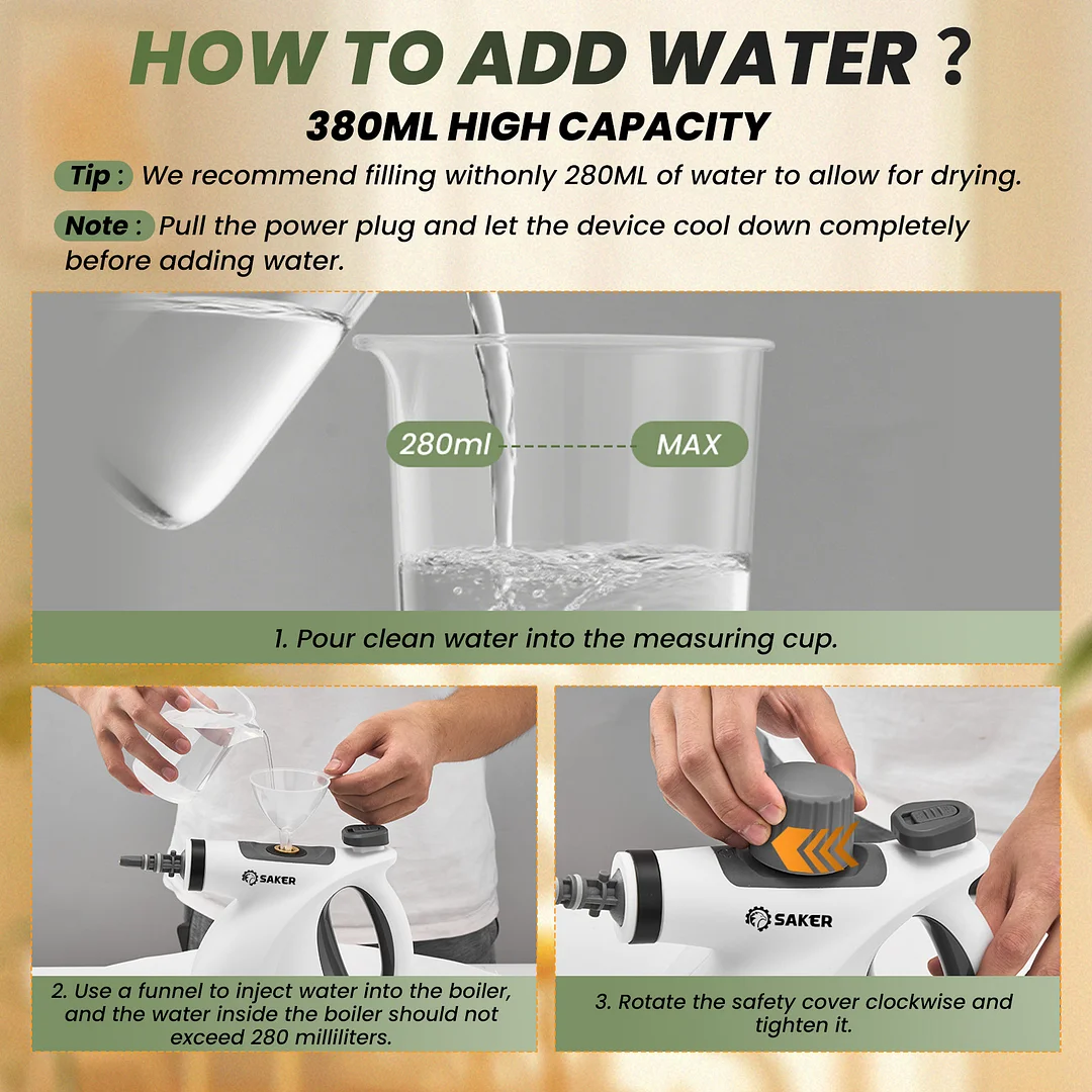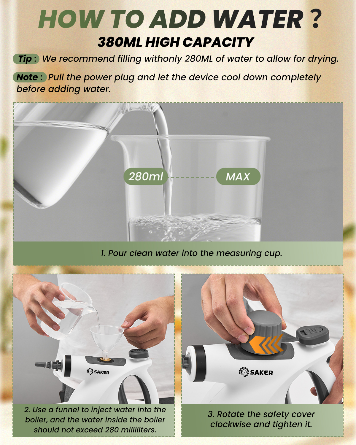 Large water capacity: Equipped with a 350ml water tank (recommended max fill: 280ml), this steam cleaner supports longer cleaning sessions with fewer refills, offering greater convenience and comfort for extended tasks.