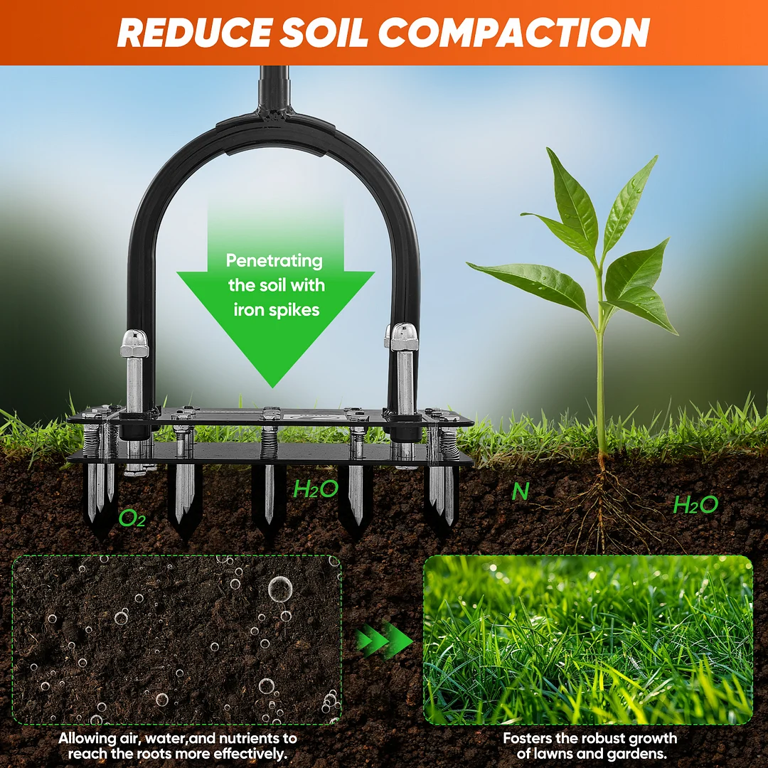 Efficient manual lawn aerator: The lawn aerator penetrates the soil with iron spikes, making it easy to insert into the ground and loosen compacted soil. It improves drainage and air circulation, allowing water, oxygen, and nutrients to reach plant roots more effectively and helping grass and seeds grow stronger.