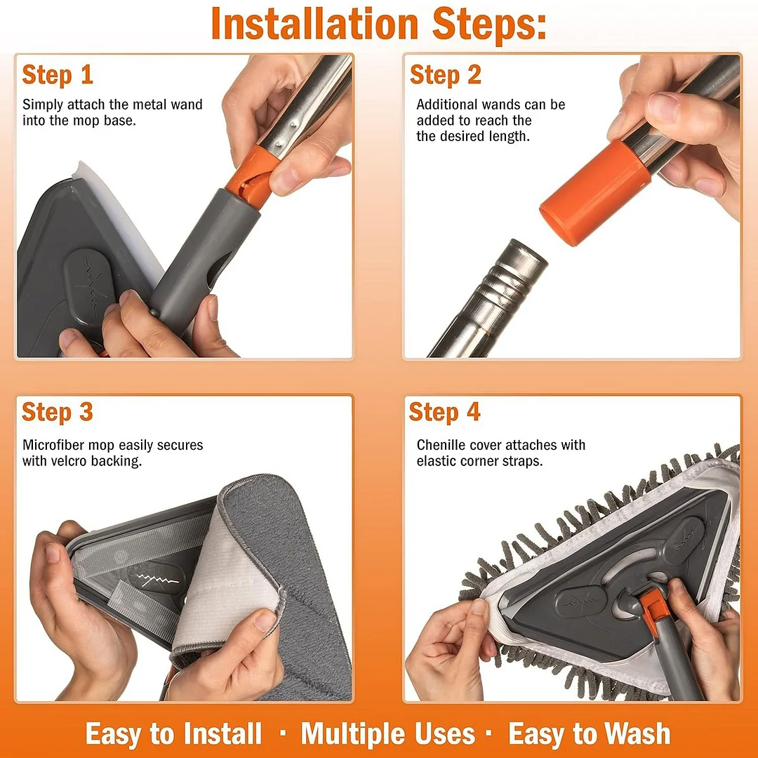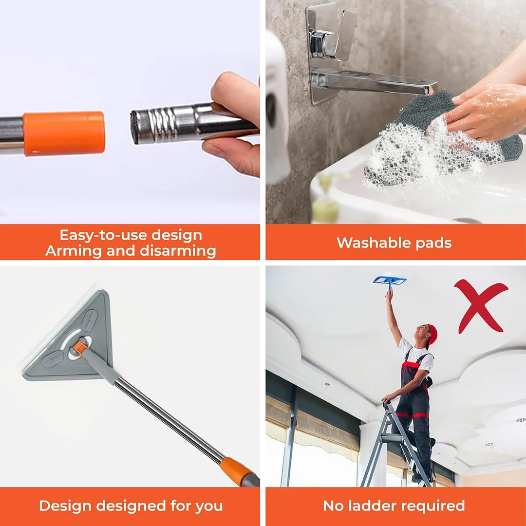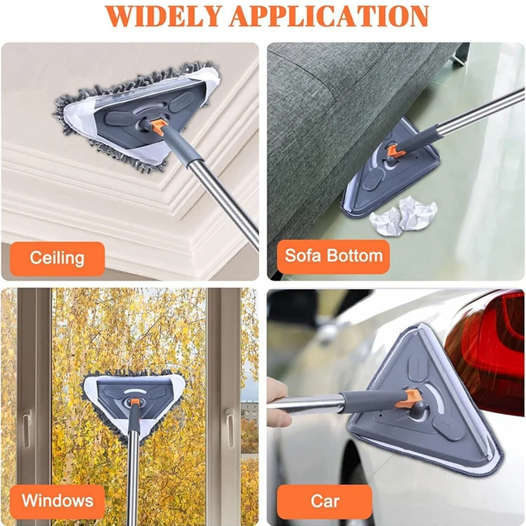 360° swivel mop head design: The triangular mop head can be adjusted to any angle, making it easier to clean corners and hard-to-reach areas. Additionally, the mop head features a locking function to ensure it does not collapse or flip when cleaning high places.