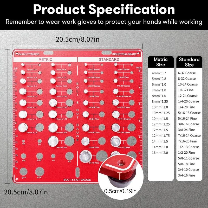 The bolt size and thread gauge is made of aluminum alloy 6061.nut and bolt thread checker Standard and Metric surface is anodized to prevent rust and corrosion.thread size checker. bolt identifier board.