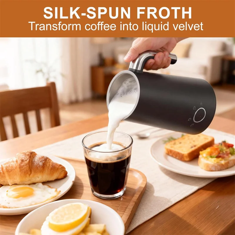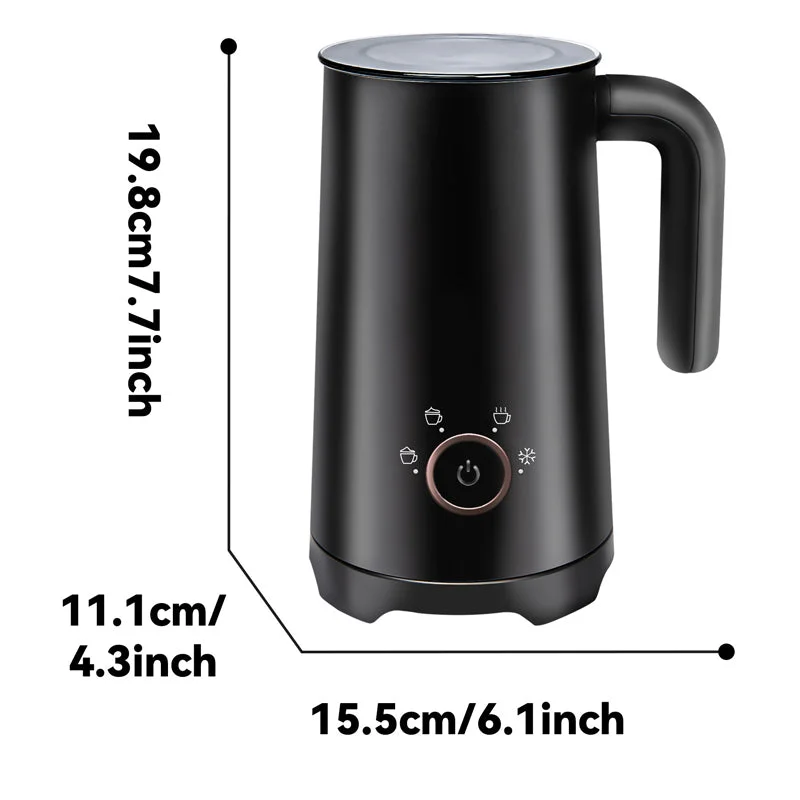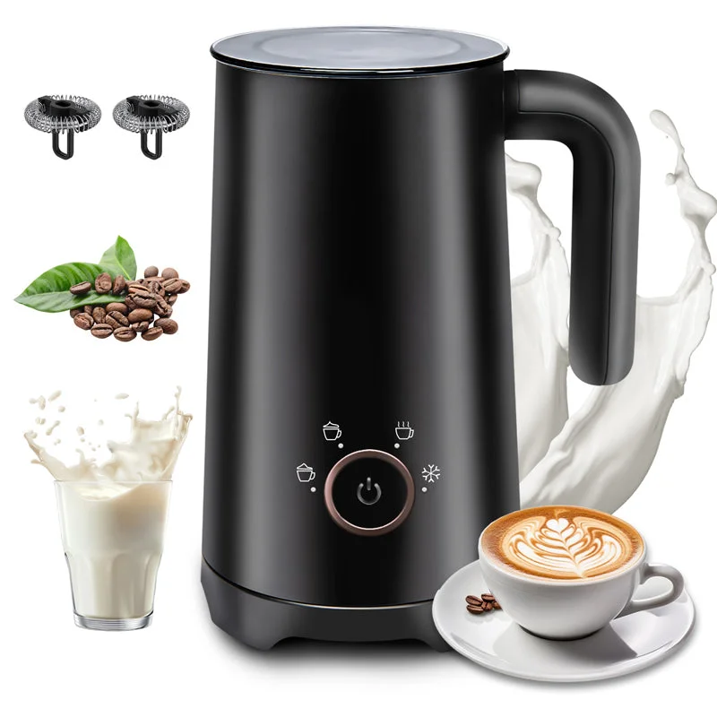 Indicator: LED ring shows the selected program (red for warm, blue for cold). Features a non-stick inner bowl, 360° rotating base, and one whisk for both frothing and heating functions.