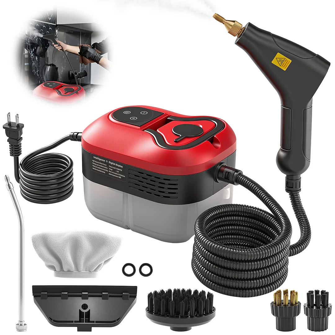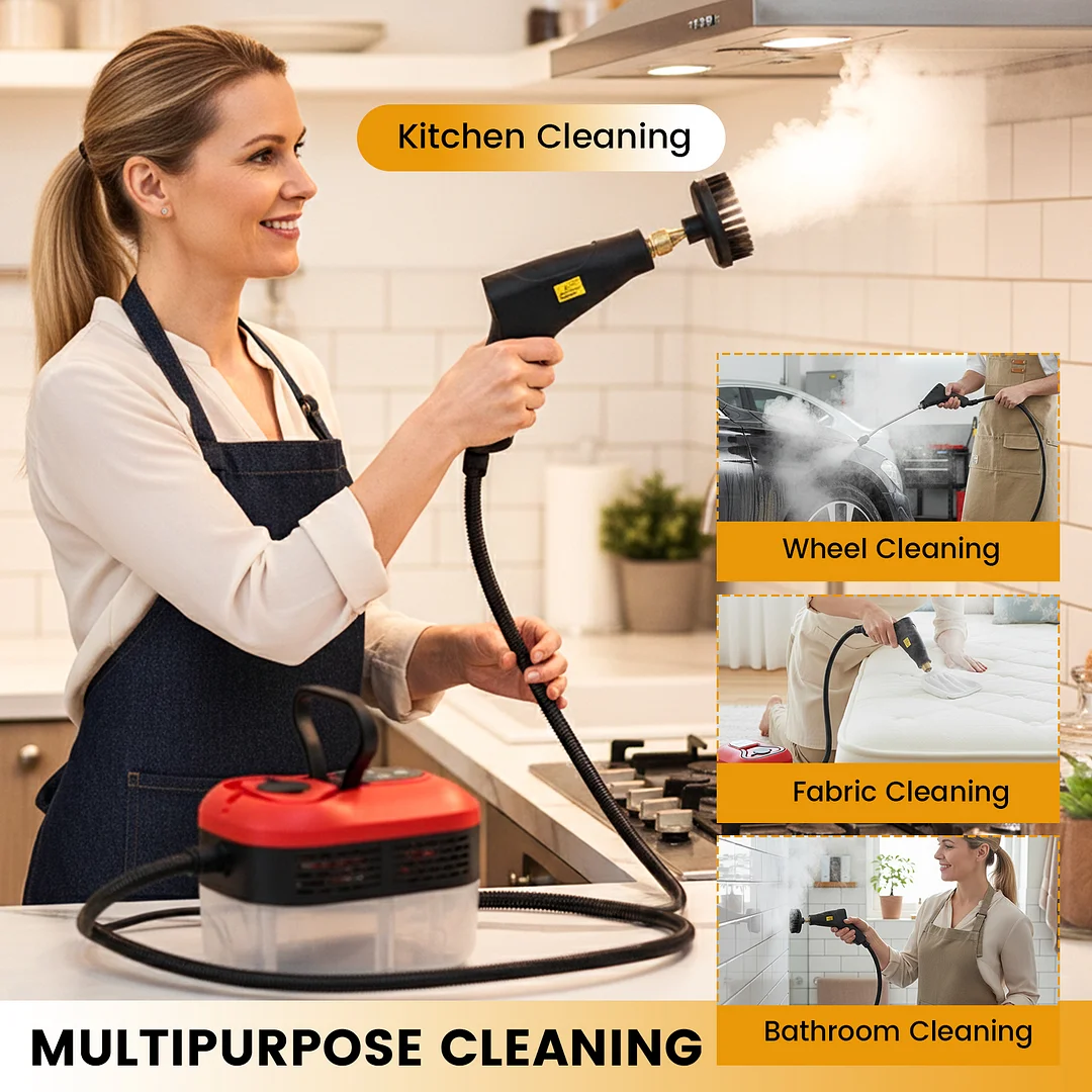 Versatile all-in-one cleaning kit: Equipped with a full set of specialized attachments for multi-scenario cleaning. The steam cleaner effortlessly tackles tiles, grout, windows, upholstery, and even pet mess-prone areas, making it perfect for deep cleaning kitchens, bathrooms, furniture, and car interiors alike.