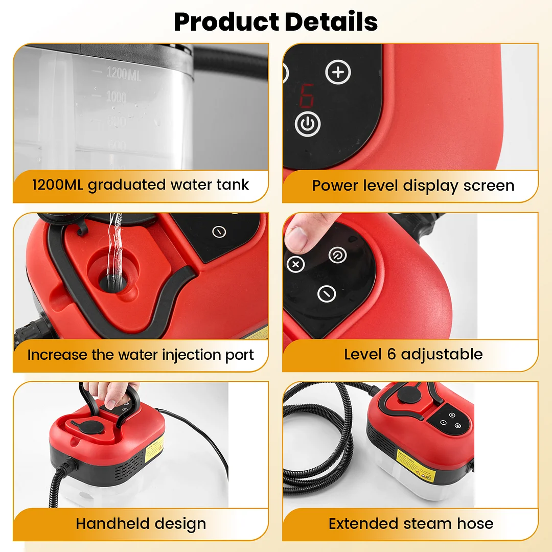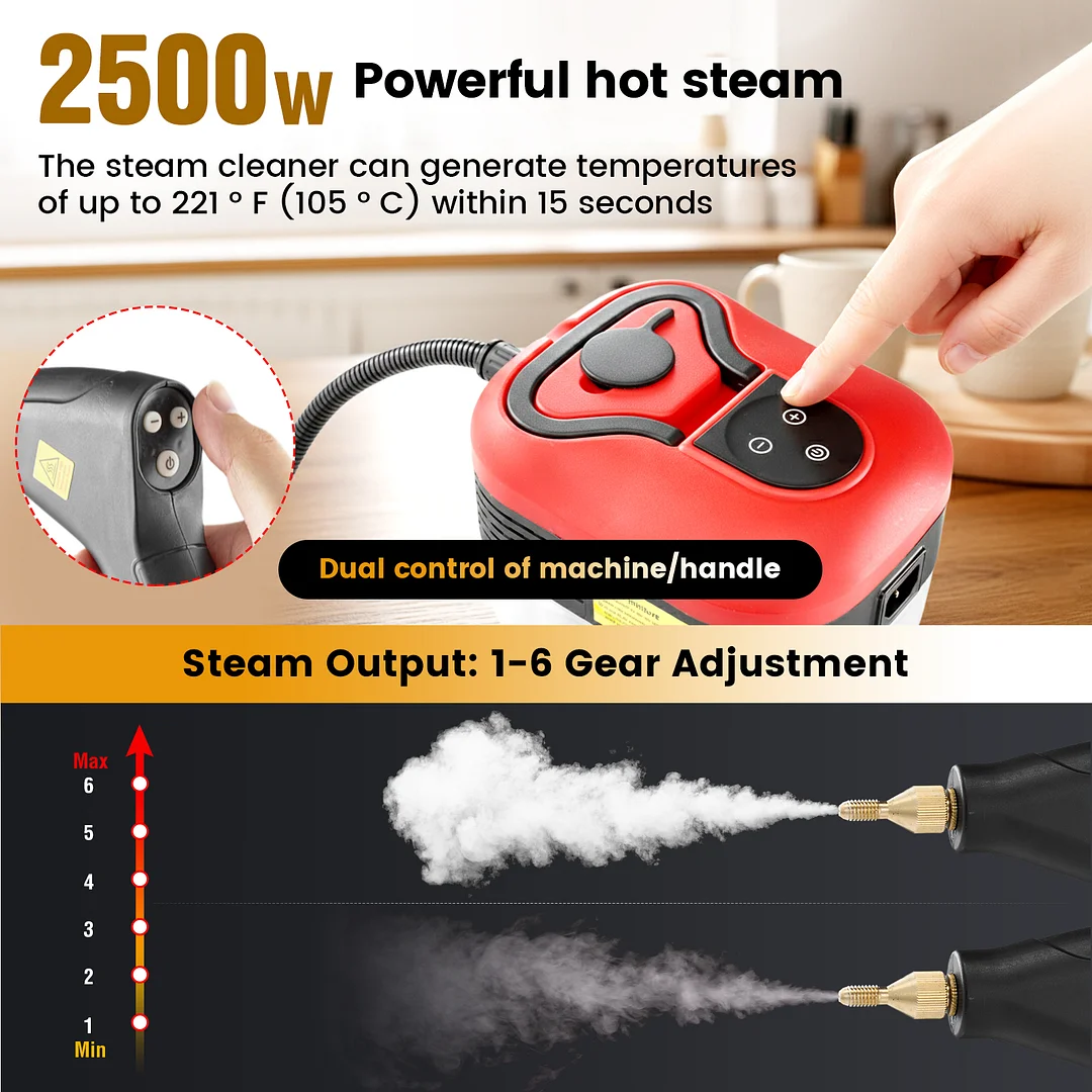 6-gear adjustable steam control: Fine-tune your cleaning power effortlessly to match any task. Adjust steam output directly: select gentle steam for delicate fabrics, or increase to powerful steam for tackling stubborn dirt on tiles and engines. Intuitive and straightforward to operate.
