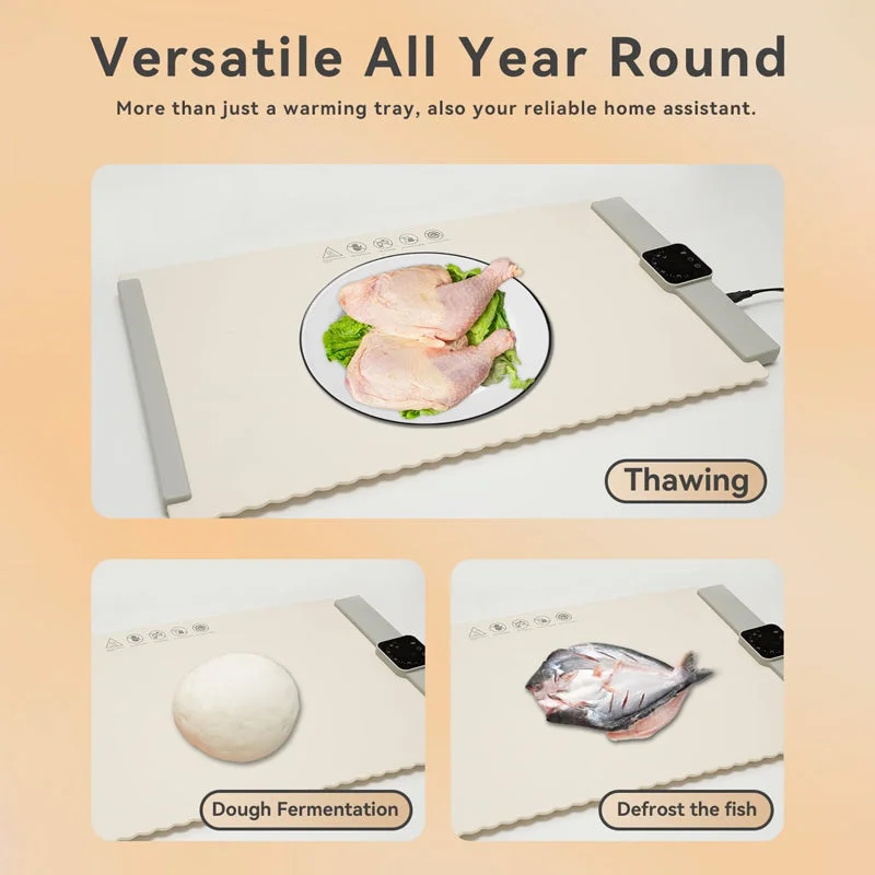 Extra large heating area: The food warming mat has evenly distributed heating wires throughout its entire range, providing fast, even heating over the entire surface. Widely used for reheating food, defrosting frozen meat, melting chocolate or cheese, helping bread dough to rise, etc. Great for buffet parties, gatherings and vacations.