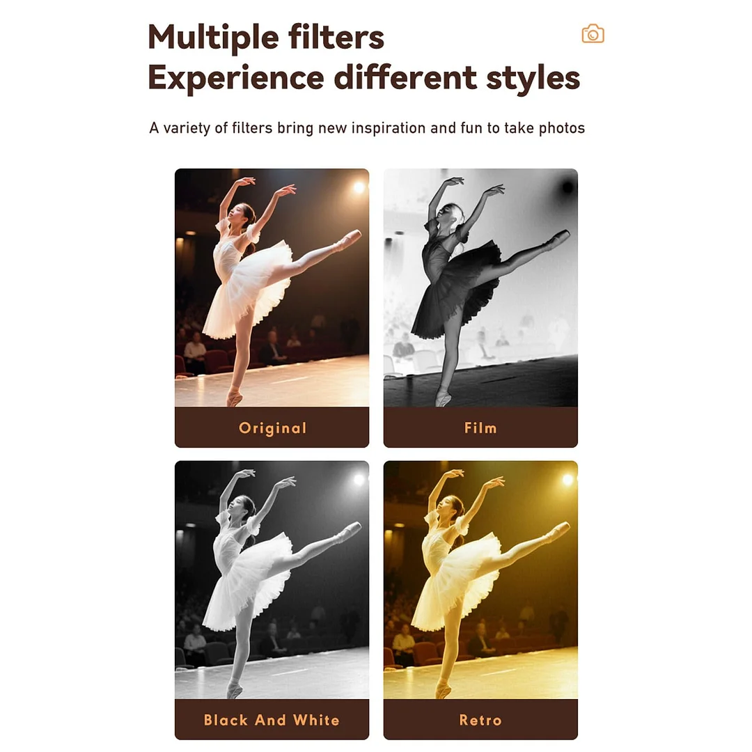 Full hd video: Supports 1080P HD video recording with H.264 compression and JPG photo format, including vintage and black and white filter options for creative shooting.