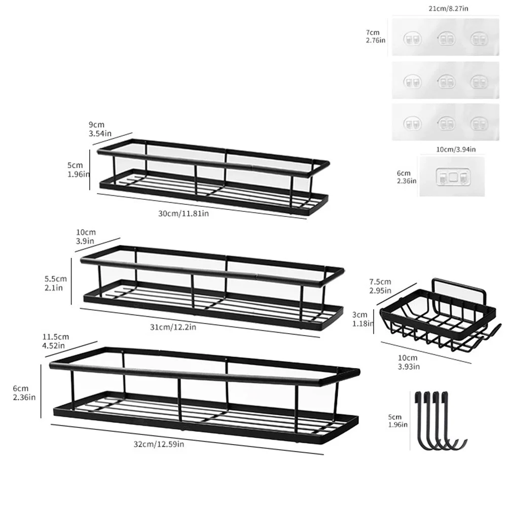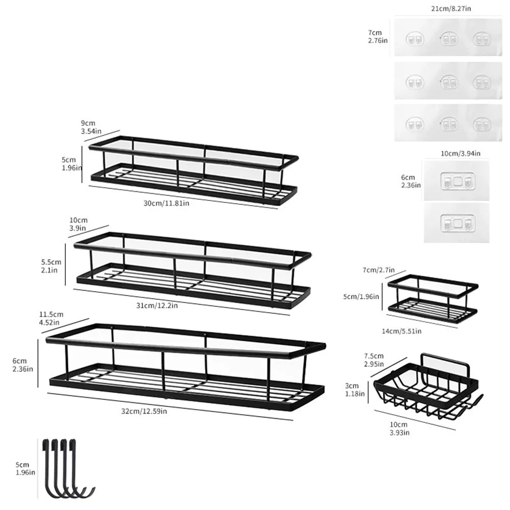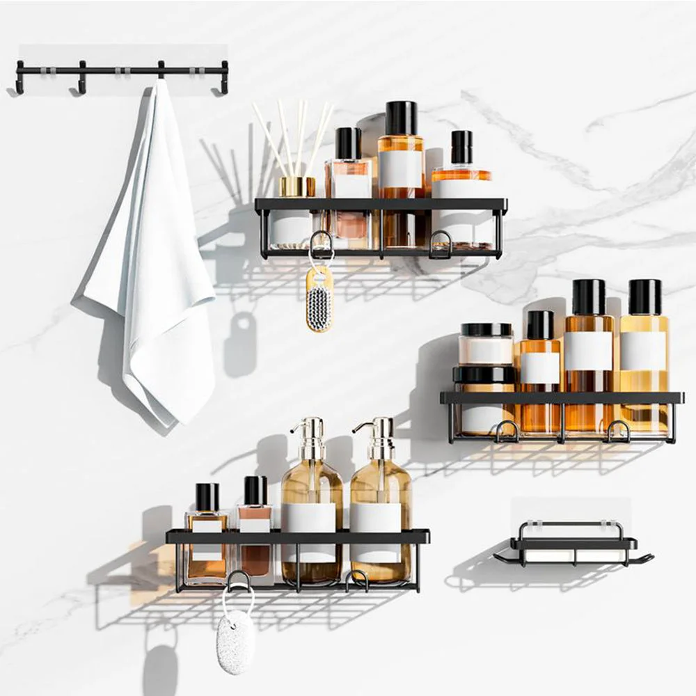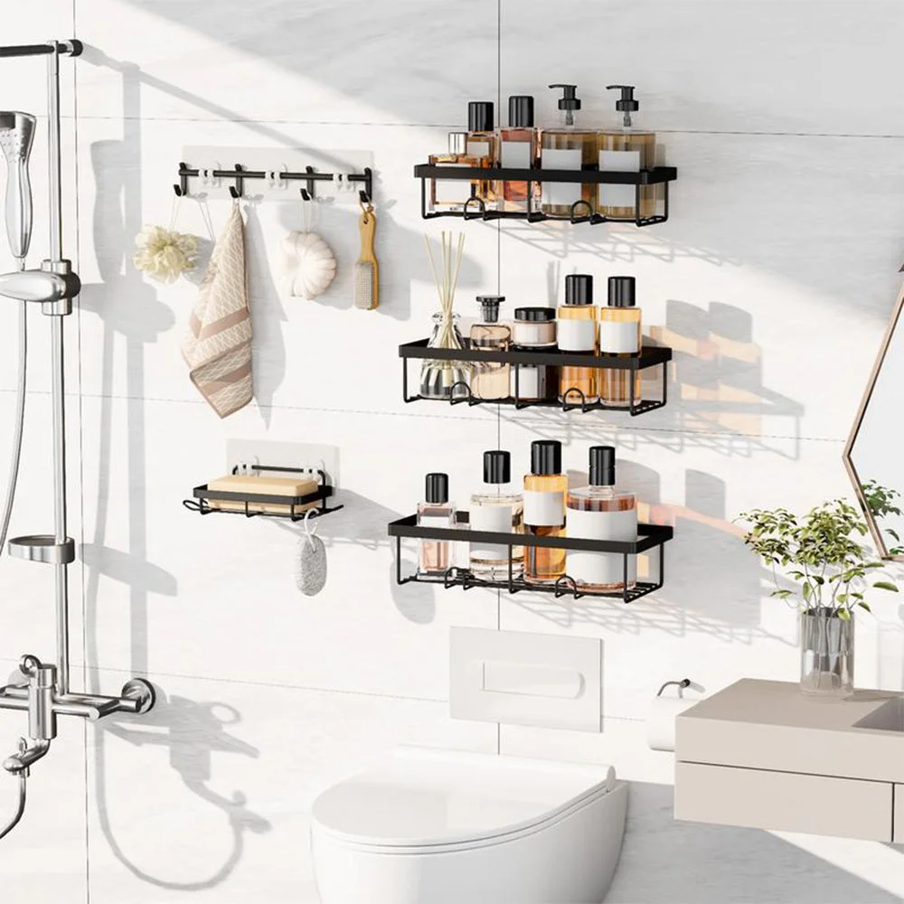 Storage: Features a 6-piece large capacity organizer set with multiple shelves, soap holder, toothbrush holder, hooks, and adhesive tapes to simplify bathroom organization.