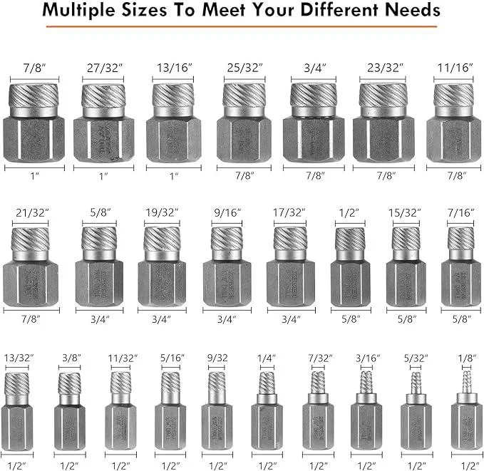 EASY-OUT BOLT-EXTRACTOR SET: This damaged-screw extractor set contains 25 pieces that featureprecision-engineered and precision-machined hexagonheads for applying maximum torque when paired withwrenches or sockets.