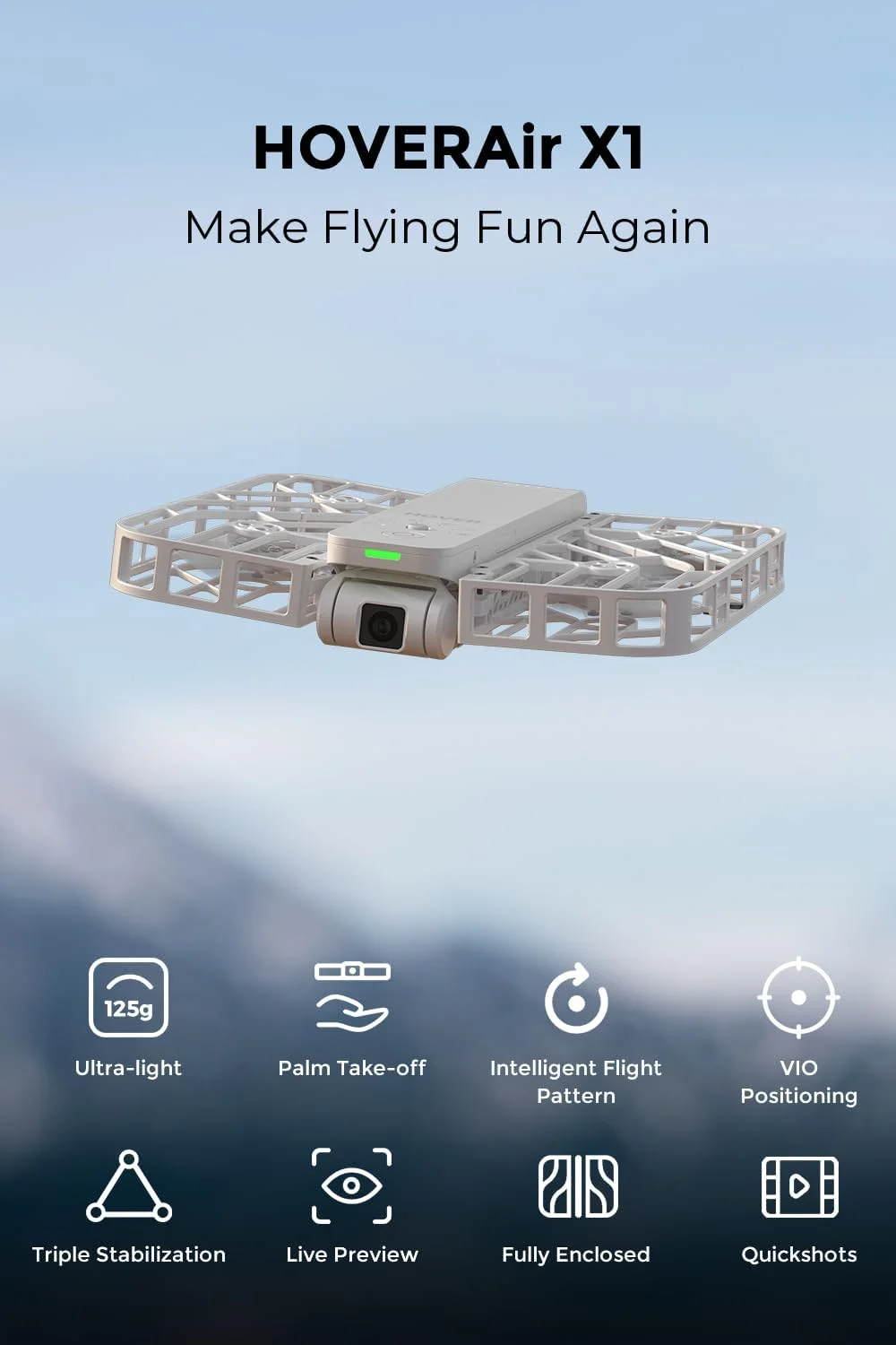 Portability and simplicity redefined: Weighing a mere 125g (4.41oz), lighter than an iPhone and exempt from the hassle of FAA registration. The foldable design makes every adventure just a fold away. Operating the HOVERAir X1 self-flying camera is simple and user-friendly. lt takes off from your palm with one click, making it easy for everyone!