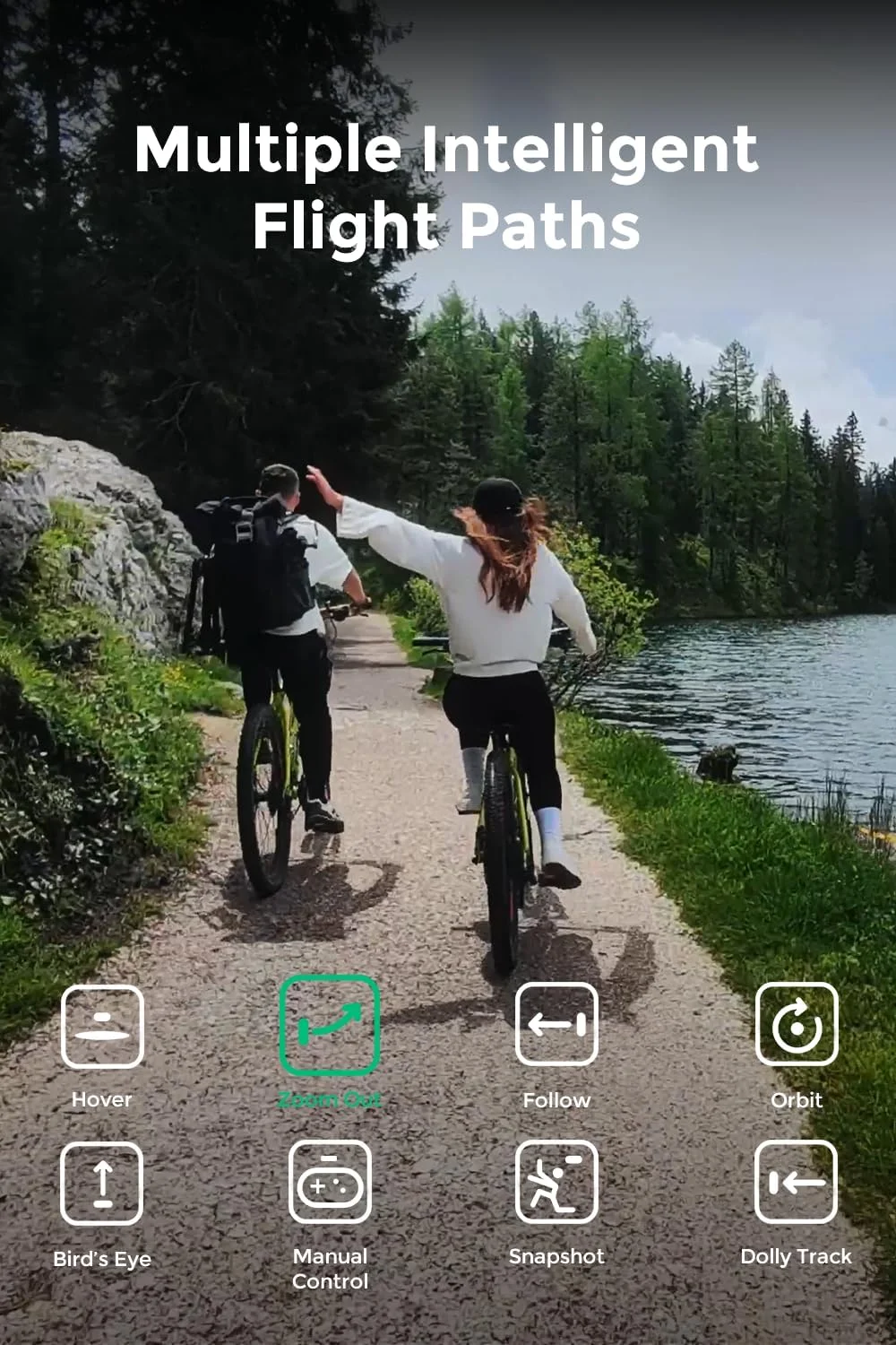 Automatic and intelligent flight paths: Experience hands-free flying with the pre-programmed flight paths, including Hover, Follow, Zoom Out, Orbit, Bird’s Eye, Manual Control, etc. Take control with Manual Control mode, tailoring your flight experience to perfection.