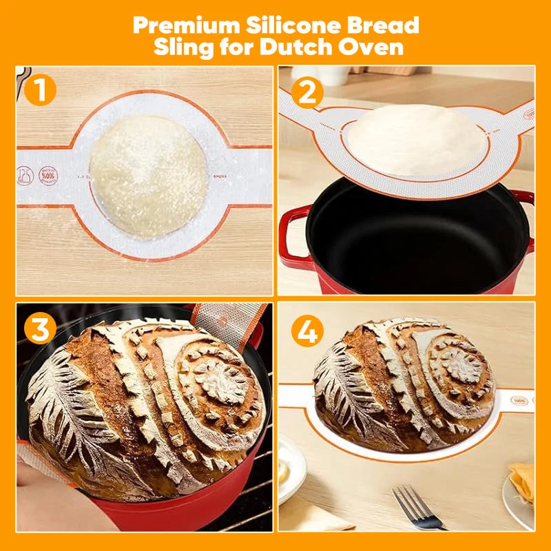 Non-stick bread sling for dutch oven: The food-grade silicone sling withstands high temperatures, prevents sticking, and features long handles for safe and easy lifting when baking in a Dutch oven.