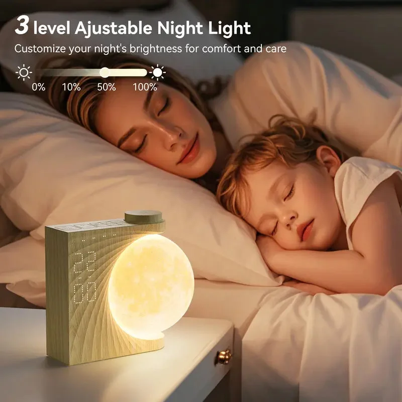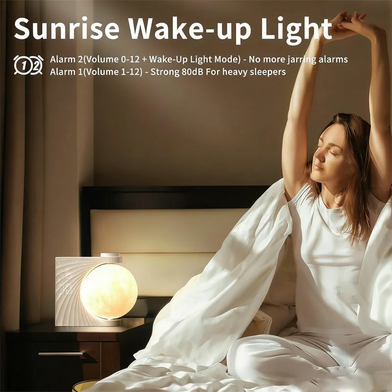 Wake up light: The sunrise alarm clock uses a gradual moon and sunrise glow that brightens 10 minutes before the alarm to wake heavy sleepers gently without sudden shock.