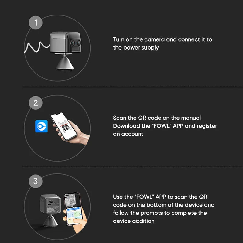 Fully wireless design & easy setup: No need for plugging in, no complex installation, and no wiring required. Simply scan the QR code, download the "FOWL" app, and follow the easy setup instructions.