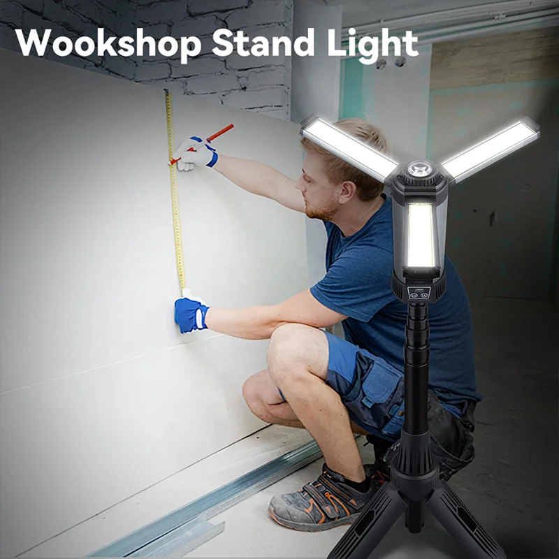 IPX65 Waterproof & TYPE-C lnput & USB Output: IPX65 waterproof technology is adopted for details from housing frames to all the connecting parts! Our LED flood light with stand can continue to provide you with stable lighting even in outdoor rainy day and snowy day! A TYPE-C charging port and USB output port have been added to charge your power tools or electronic devices without looking for an external power bank,especially suitable for dealing with emergencies during camping trip or power cut.
