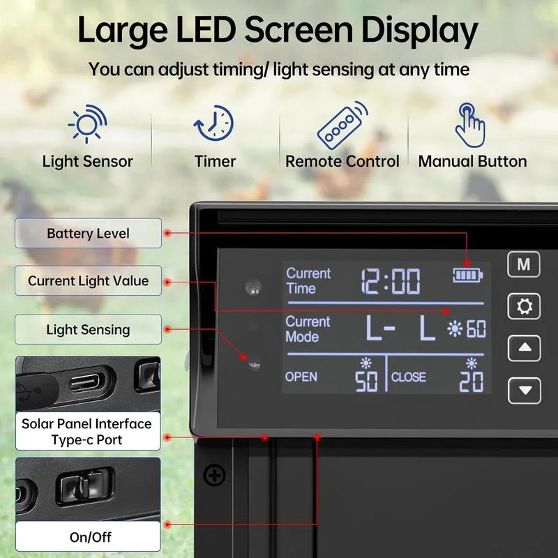 Smart time and light-sensing adjustment: It supports time and light-sensing adjustment functions, allowing users to customize the door opening and closing times or set light-sensing modes at any time. This ensures the chicken door automatically opens at sunrise and closes at sunset, achieving fully automated management.