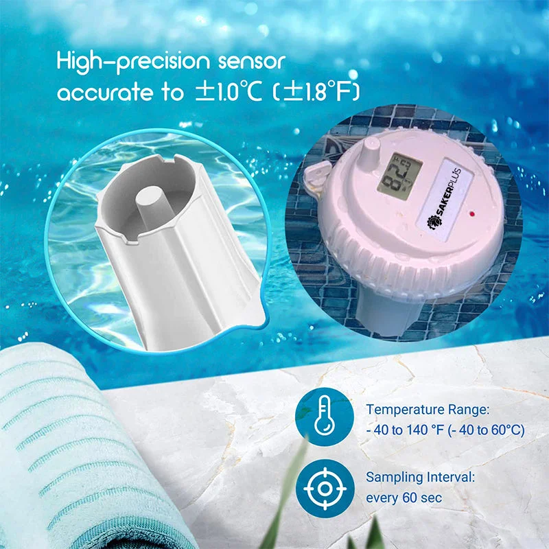 High accuracy, wide range: Equipped with a high-precision sensor, the SAKERPLUS Wireless Pool Thermometer delivers accurate readings with a margin of just ±1.0°C (±1.8°F). Whether you're enjoying a warm spa or checking your outdoor pool in winter, this device ensures reliable performance. With a wide temperature range of -40 to 140°F (-40 to 60°C), it’s built to handle extreme conditions with ease — making it perfect for pools, hot tubs, fish ponds, and more.