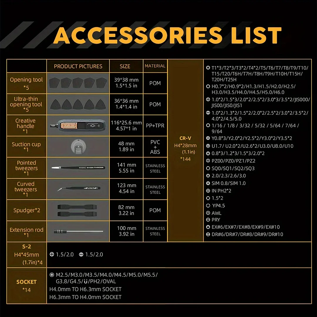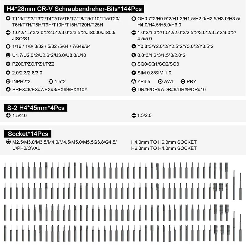 Torx: T1*3 T2*3 T3*2 T4*2 T5 T6 T7 T8 T9 T10 T15 T20 T6H T7H T8H T9H T10H T15H T20H T25H