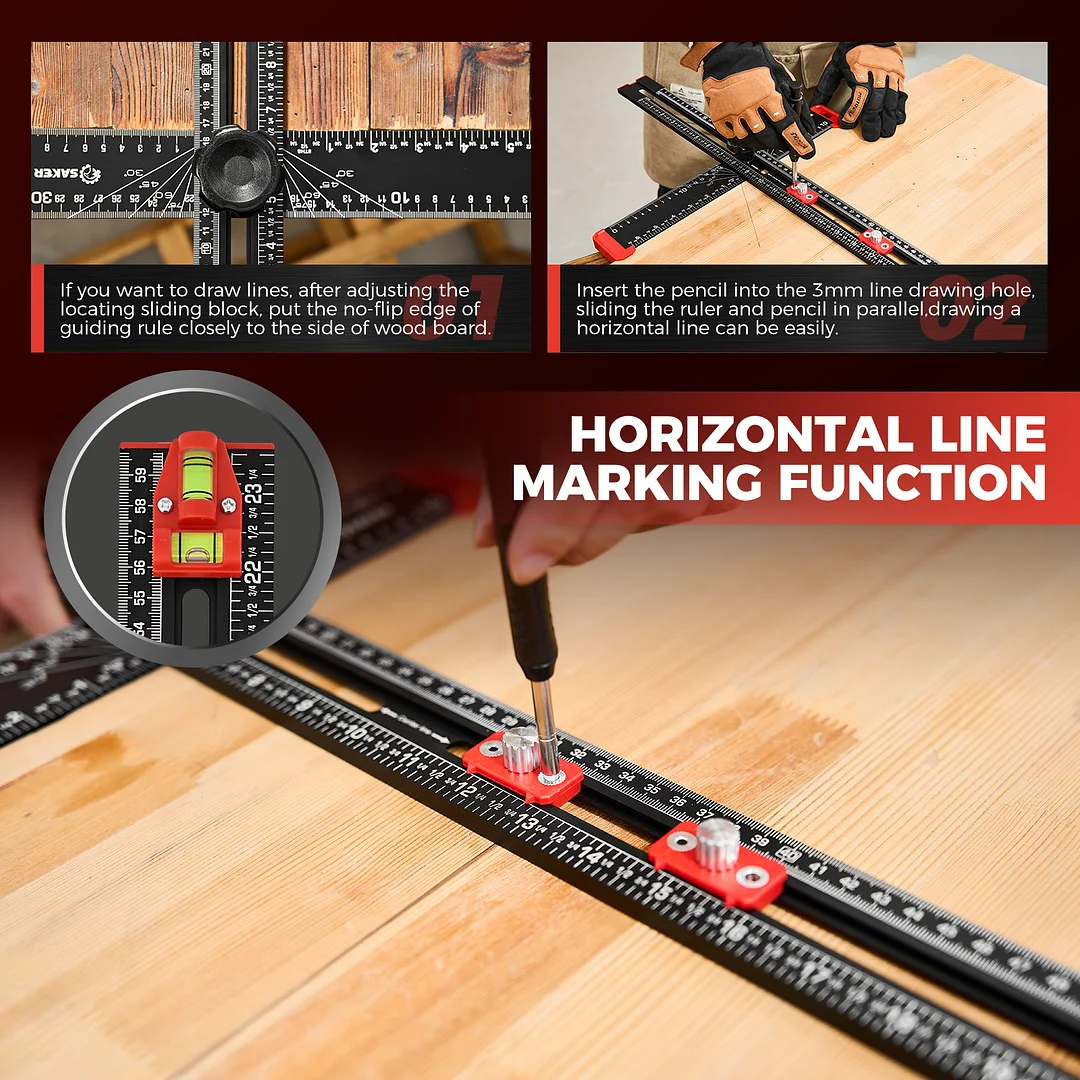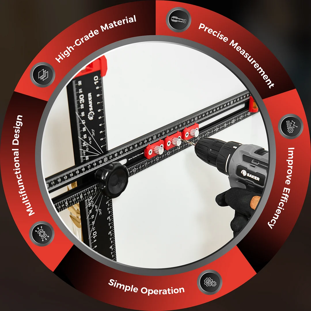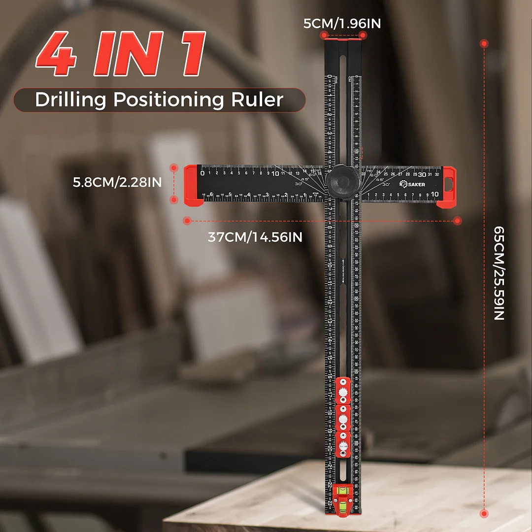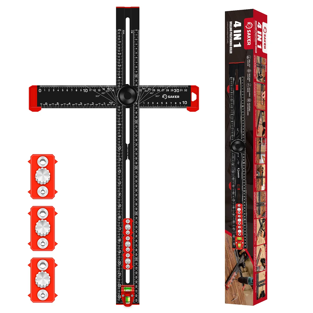 EXPANSIVE UTILITY: Beyond its primary role in drilling, the Saker 4-in-1 Drilling Positioning Ruler proves invaluable for diverse applications including the precise installation of door handles, crafting bespoke shelves, and constructing cabinets. Its multifaceted design enables versatility, rendering it an indispensable tool for an array of woodworking and DIY projects. HIGHLY ACCURATE: The saker drill positioning ruler doubles up as a marking gauge woodworking tool, boasting three sets of adjustable positioning blocks. This innovative design ensures enhanced precision, facilitating swift and accurate drilling, nailing, or marking tasks. Elevate your woodworking projects with increased efficiency and accuracy with this versatile tool. DUAL-AXIS BUBBLE LEVEL: Saker woodworking square comes with auxiliary dual-axis bubble levels, aiding in the calibration of both horizontal and vertical alignments. This feature ensures precise leveling and perpendicularity, facilitating accurate drilling and installation tasks, even on uneven surfaces. RELIABLE MATERIAL: Crafted from premium aluminum alloy, the Saker 4-in-1 drilling positioning ruler guarantees durability and resilience. The wear-resistant printing ensures longevity, safeguarding against fading and preserving precise measurements throughout extended use. VERSATILE ADJUSTABLE CAPABILITY: Saker T square ruler features ABS knobs for effortless adjustment of length and angles, ensuring flexibility in measuring both dimensions and angles. With this versatile capability, users can easily adapt the tool to accommodate various project requirements.