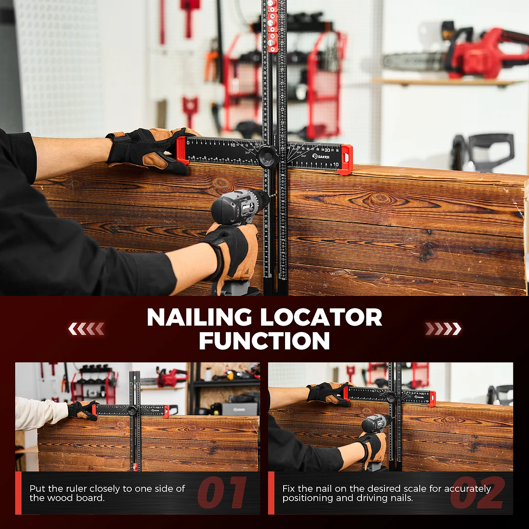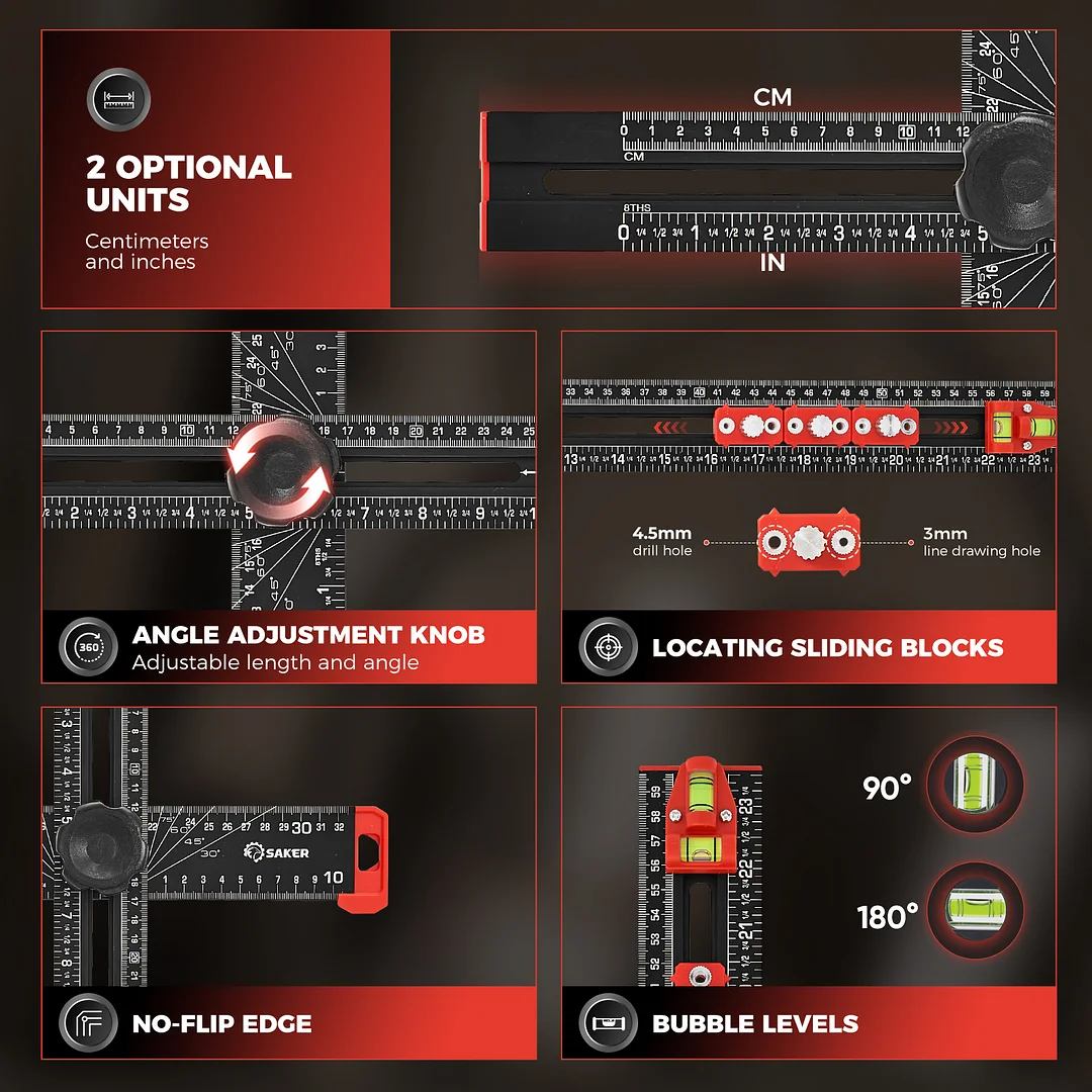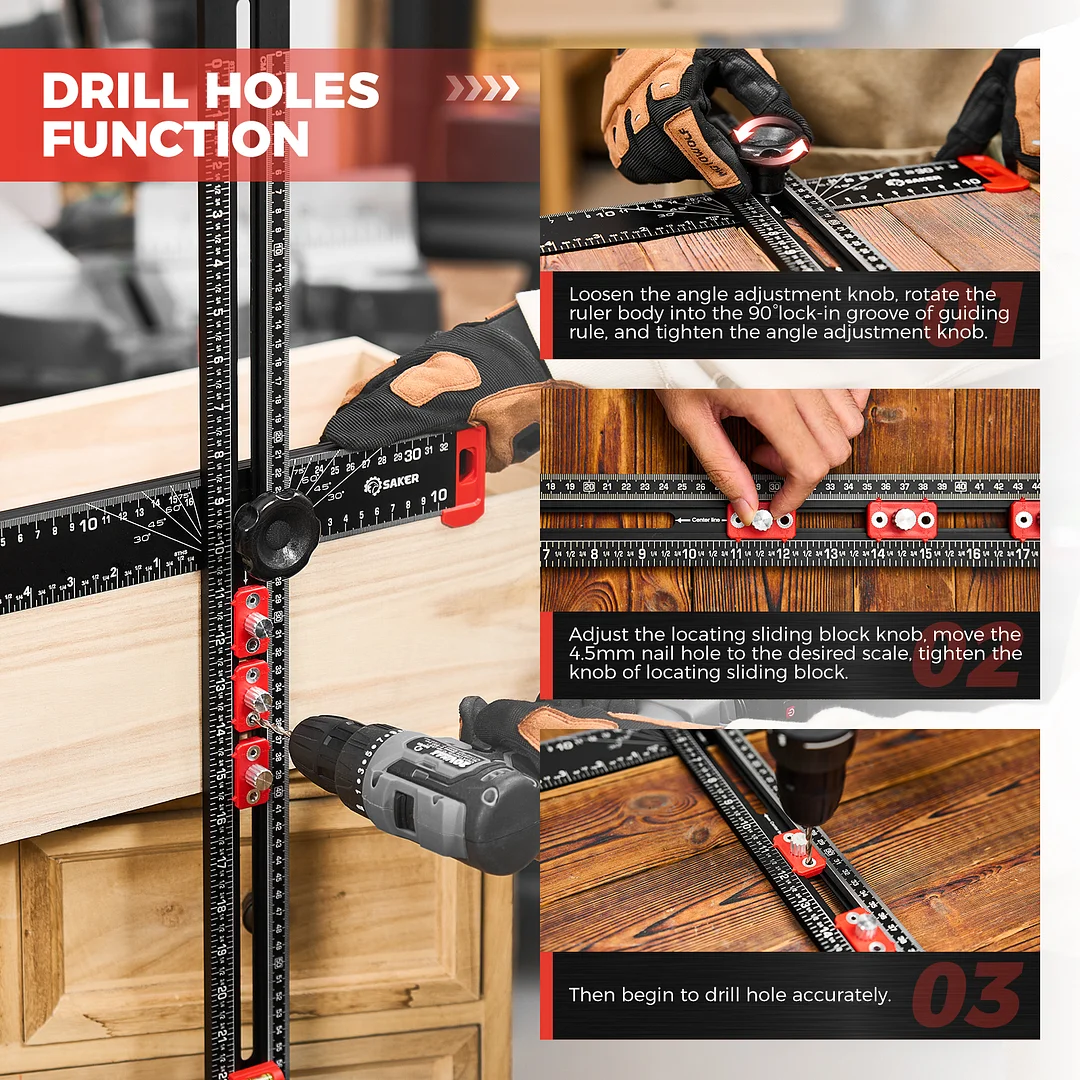 EXPANSIVE UTILITY: Beyond its primary role in drilling, the Saker 4-in-1 Drilling Positioning Ruler proves invaluable for diverse applications including the precise installation of door handles, crafting bespoke shelves, and constructing cabinets. Its multifaceted design enables versatility, rendering it an indispensable tool for an array of woodworking and DIY projects. HIGHLY ACCURATE: The saker drill positioning ruler doubles up as a marking gauge woodworking tool, boasting three sets of adjustable positioning blocks. This innovative design ensures enhanced precision, facilitating swift and accurate drilling, nailing, or marking tasks. Elevate your woodworking projects with increased efficiency and accuracy with this versatile tool. DUAL-AXIS BUBBLE LEVEL: Saker woodworking square comes with auxiliary dual-axis bubble levels, aiding in the calibration of both horizontal and vertical alignments. This feature ensures precise leveling and perpendicularity, facilitating accurate drilling and installation tasks, even on uneven surfaces. RELIABLE MATERIAL: Crafted from premium aluminum alloy, the Saker 4-in-1 drilling positioning ruler guarantees durability and resilience. The wear-resistant printing ensures longevity, safeguarding against fading and preserving precise measurements throughout extended use. VERSATILE ADJUSTABLE CAPABILITY: Saker T square ruler features ABS knobs for effortless adjustment of length and angles, ensuring flexibility in measuring both dimensions and angles. With this versatile capability, users can easily adapt the tool to accommodate various project requirements.